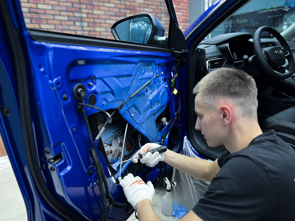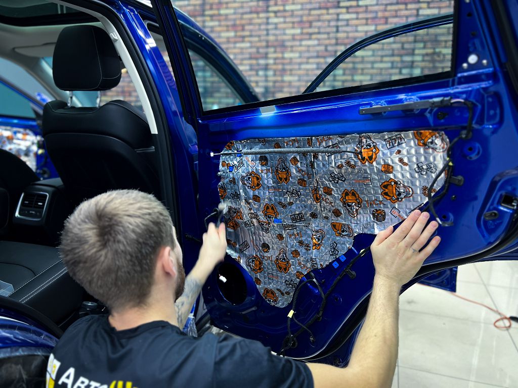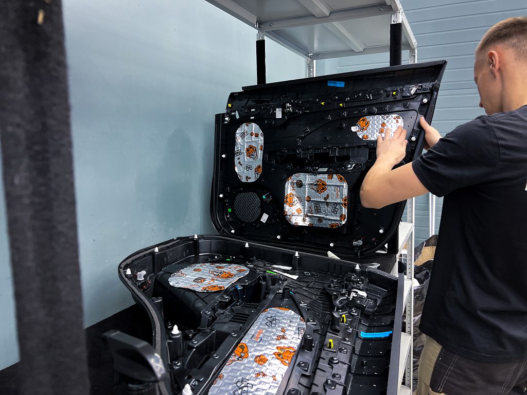 Шумоизоляция дверей Джили Атлас Вторым слоем внутрь двери поверх виброизоляции клеим современный шумо и теплоизолятор Шумофф Комфорт 6.