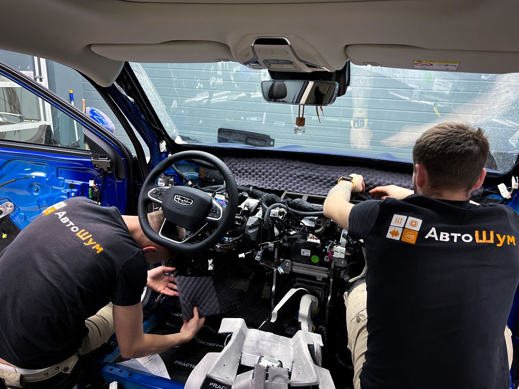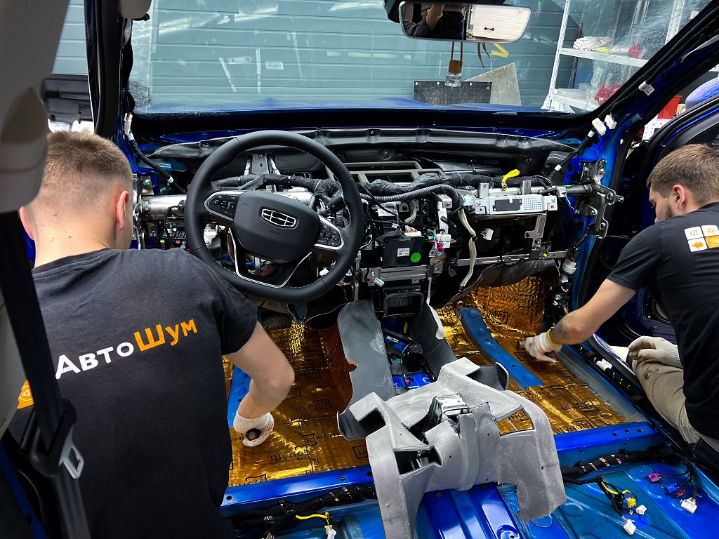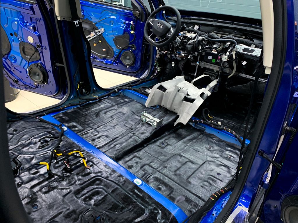 Виброизоляция пола Джили Атлас Под заднее сиденье клеим менее тяжелый толстый Шумофф М3.