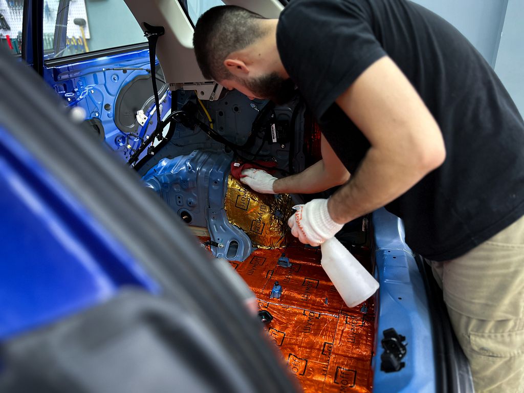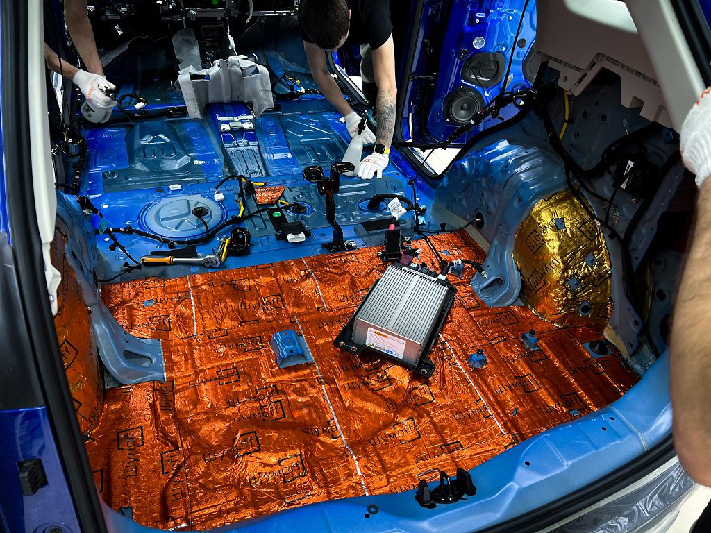 Шумоизоляция пола Джили Атлас Вторым слоем поверх M4 клеим шумопоглотитель с черным влагозащитным покрытием Шумофф Герметон 7Л.