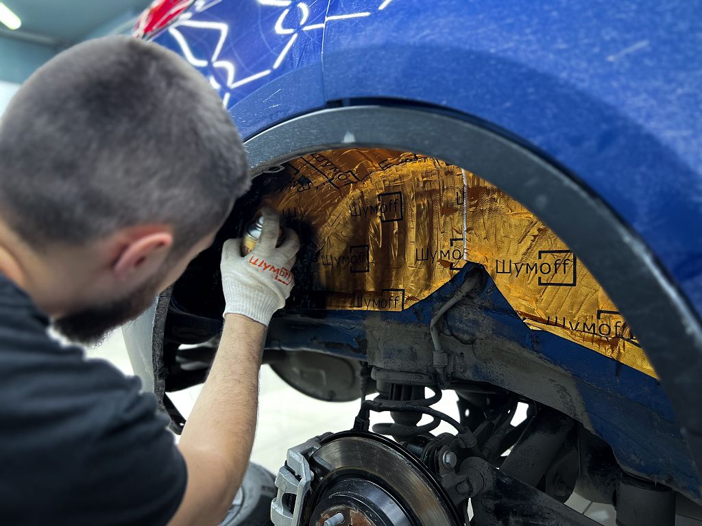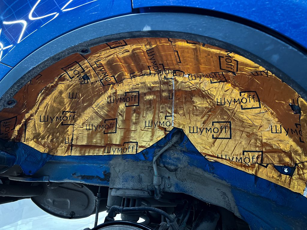 На крылья клеим также Шумофф Base 4 А для участка такого как арки используем шумопоглотитель Шумофф Flex A15. Что также позволит значительно уменьшить исходящий от них шум.