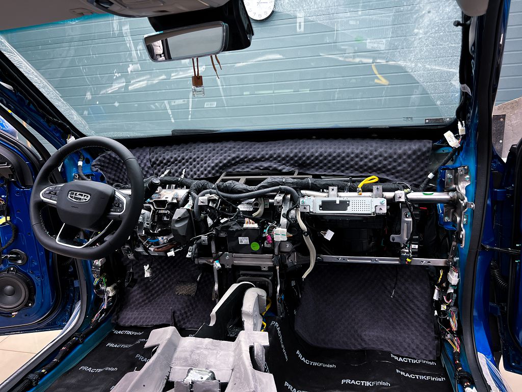 Виброизоляция корпуса панели Джили Атлас Переходим к оклейке самого корпуса панели, первым слоем частично наносим виброизоляцию Шумофф Joker, создавая тем самым идеальный баланс. Такая частичная оклейка позволит нам чрезмерно не утяжелять панель и придать ей необходимую сбитость