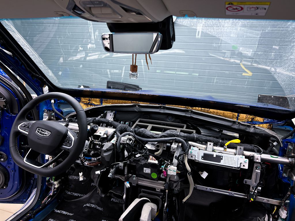 Разбор панели и центральной консоли Джили Атлас Приступаем к разбору панели и центральной консоли, аккуратно демонтируем воздуховоды, молдинги, декоративные вставки. Далее переходим к электронике, отключаем провода от магнитолы, климат контроля и различных кнопок, никакого вмешательства влияющего на гарантию не происходит, мы лишь штатно отключаем и подключаем разъемы.