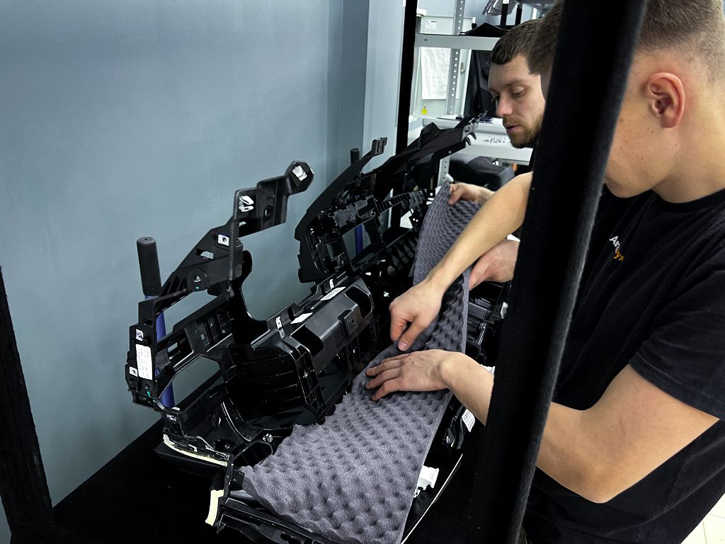 Откручиваем и вынимаем сиденья, пластик и центральную консоль. Все детали салона складываем на специальный стеллаж, что бы сохранить их в первозданном виде.