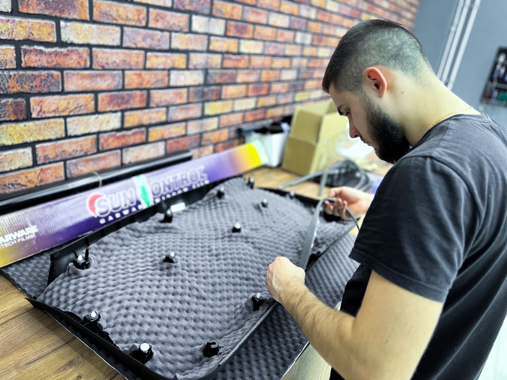 Переходим к оклейке самого корпуса панели, первым слоем частично наносим виброизоляцию Шумофф Joker, создавая тем самым идеальный баланс. Такая частичная оклейка позволит нам чрезмерно не утяжелять панель и придать ей необходимую сбитость