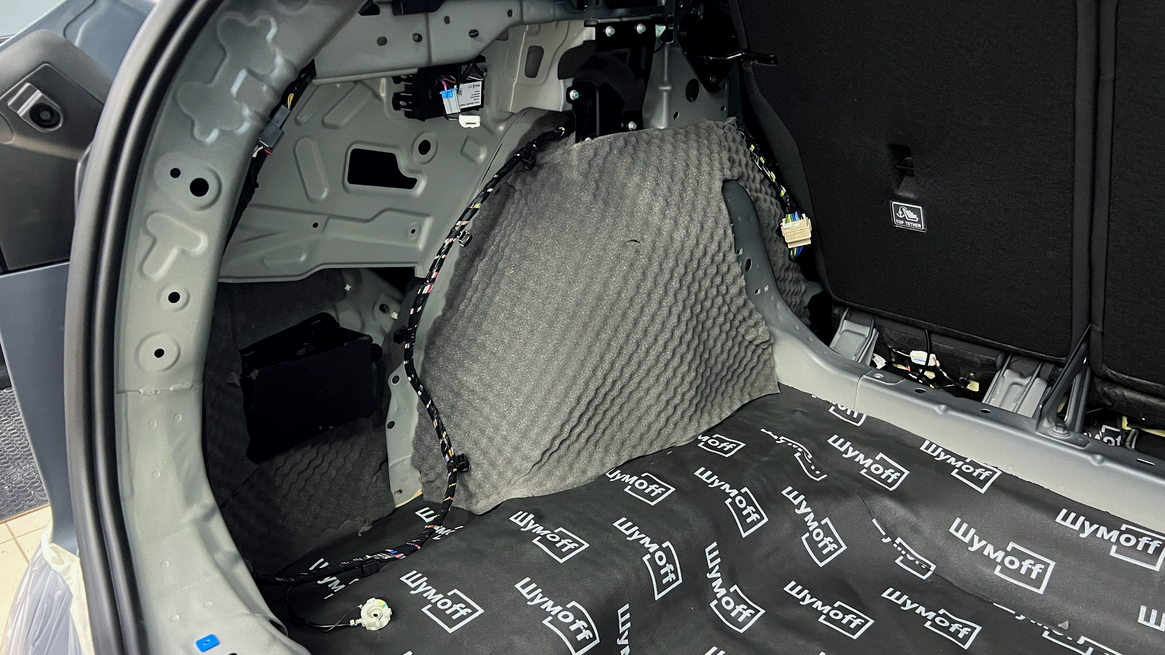 Первым слоем на дно багажника клеим виброизоляцию толщиной 3мм Шумофф М3.