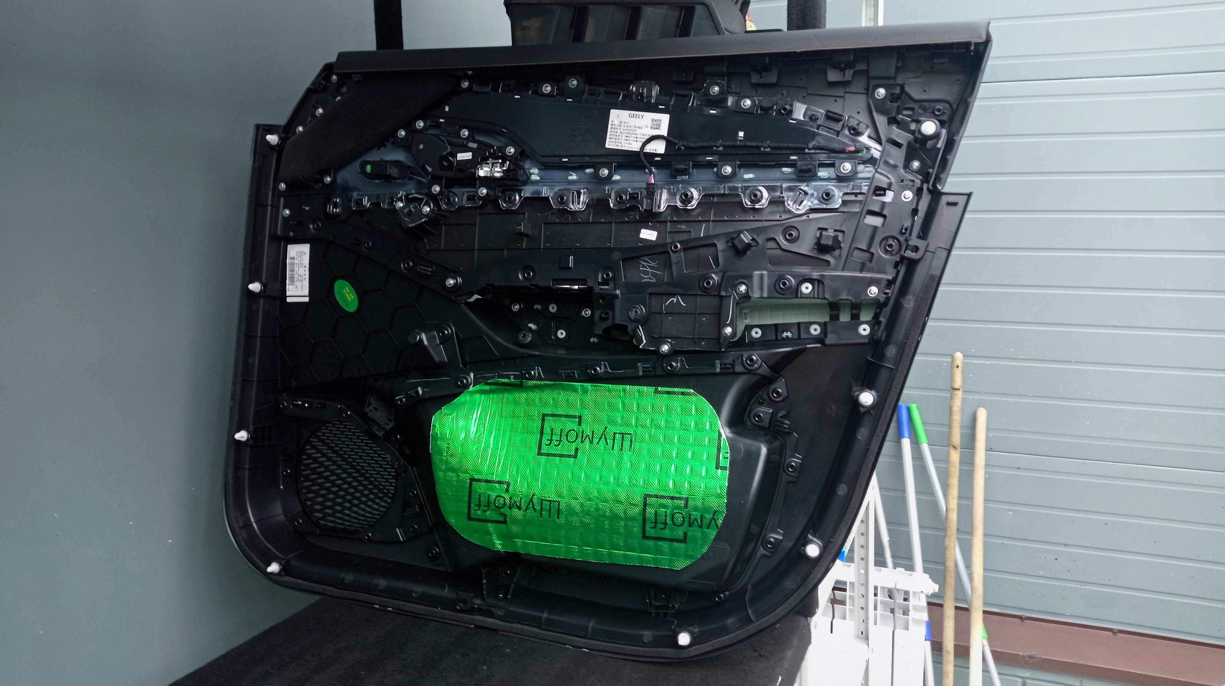 Оклейка технологических отверстий двери Джили Монжаро Для третьего слоя на технологические отверстия используем так же Joker. Данная совокупность слоёв улучшат звучание акустики, а также засчет увеличения массы двери будут закрываться более четко, тихо и плотно.