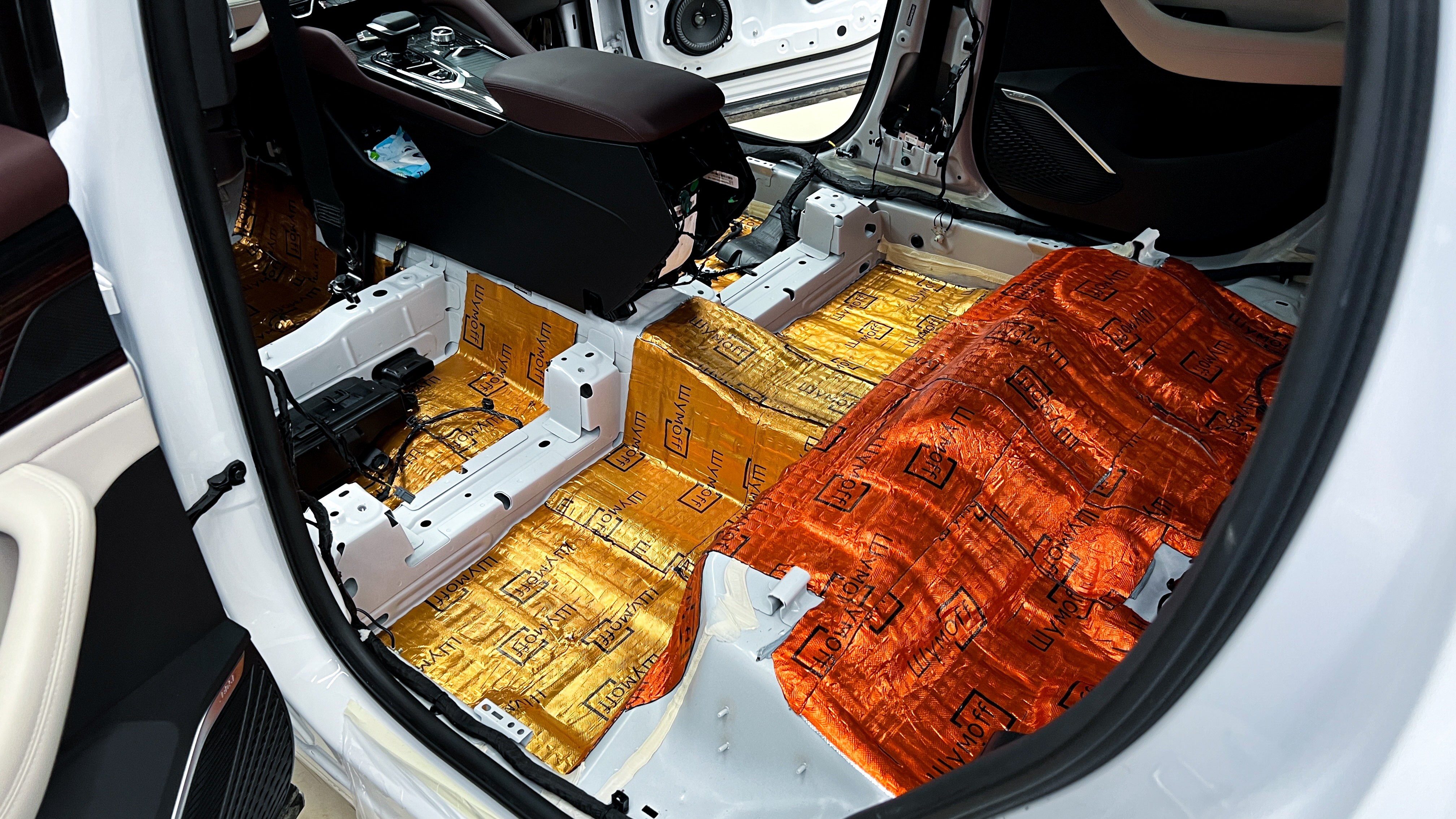 Шумоизоляция пола Джили Монжаро Вторым слоем поверх M4 клеим шумопоглотитель с черным влагозащитным покрытием Шумофф Герметон 7Л.