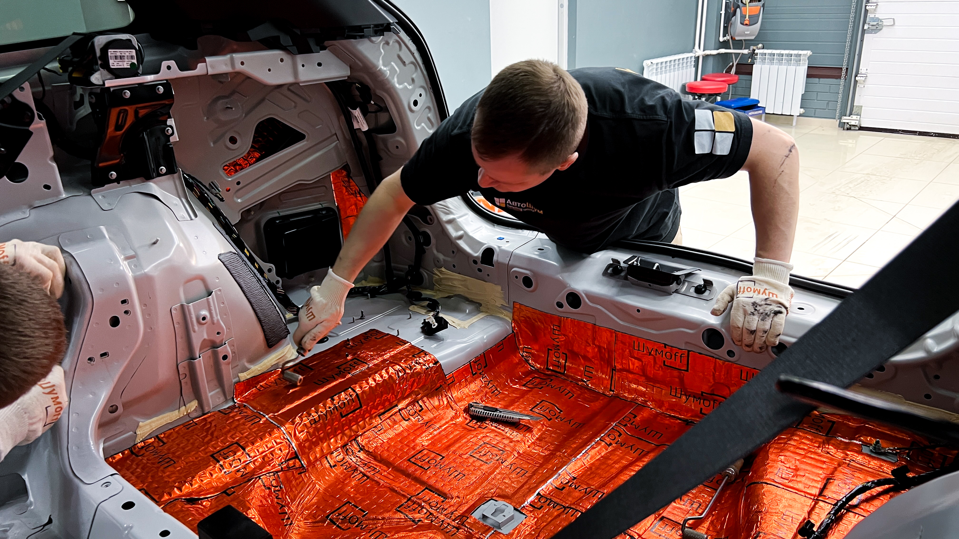 Весь пол от моторной перегородки и под задним сиденьем оклеиваем шумо и теплоизолятором Шумофф Base 4.