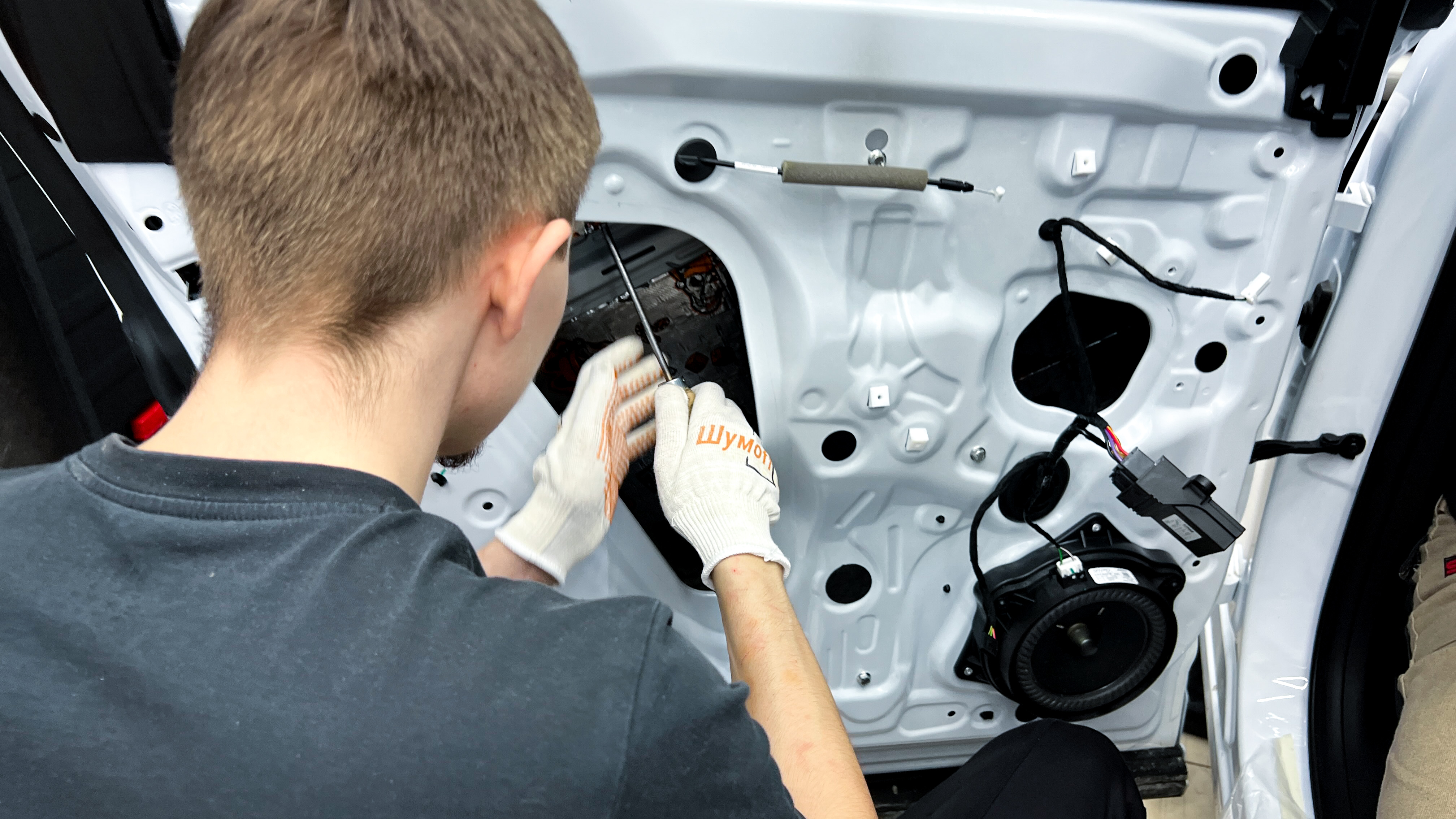 Переходим к оклейке самого корпуса панели, первым слоем частично наносим виброизоляцию Шумофф Joker, создавая тем самым идеальный баланс. Такая частичная оклейка позволит нам чрезмерно не утяжелять панель и придать ей необходимую сбитость