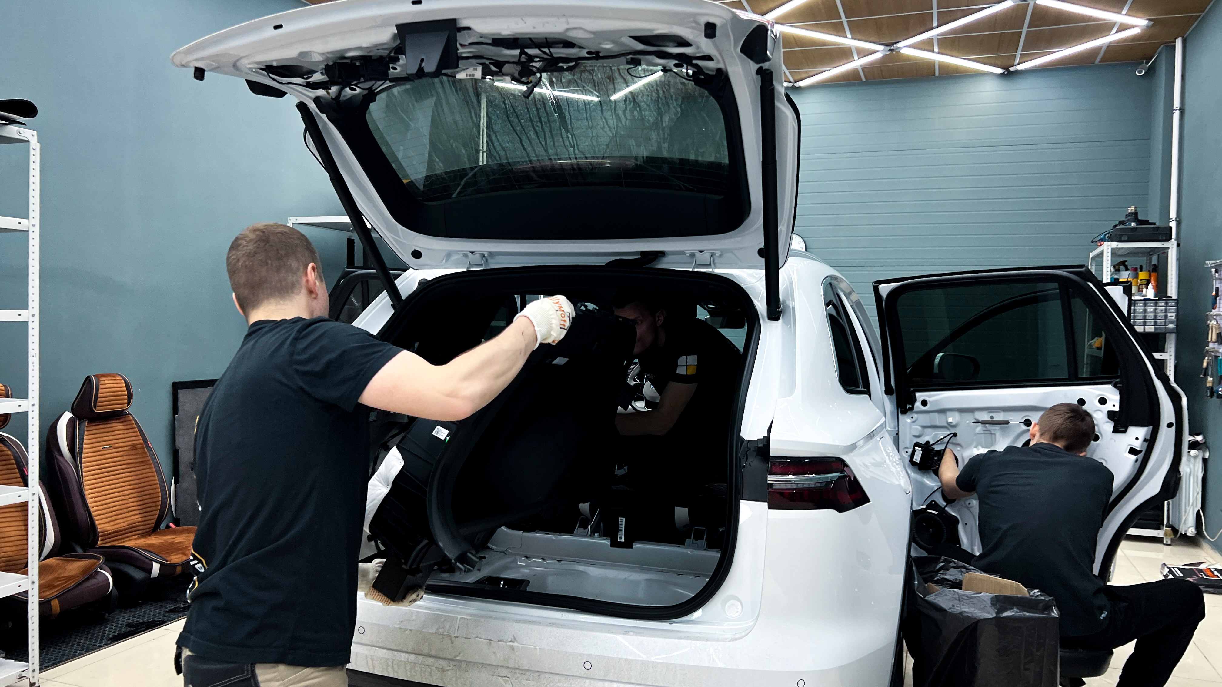 На арки клеим также Шумофф М3, а для крыльев используем менее тяжелый М2. Оклеиваем максимальную площадь багажника за исключением усилителей и ребер жесткости. Данная компоновка материалов позволит идеально достичь нужной эффективности при минимальном увеличении веса, что вместе с виброизоляцией пола также поможет нам снизить вибрацию от дороги, увеличить целостность и сбитость авто.