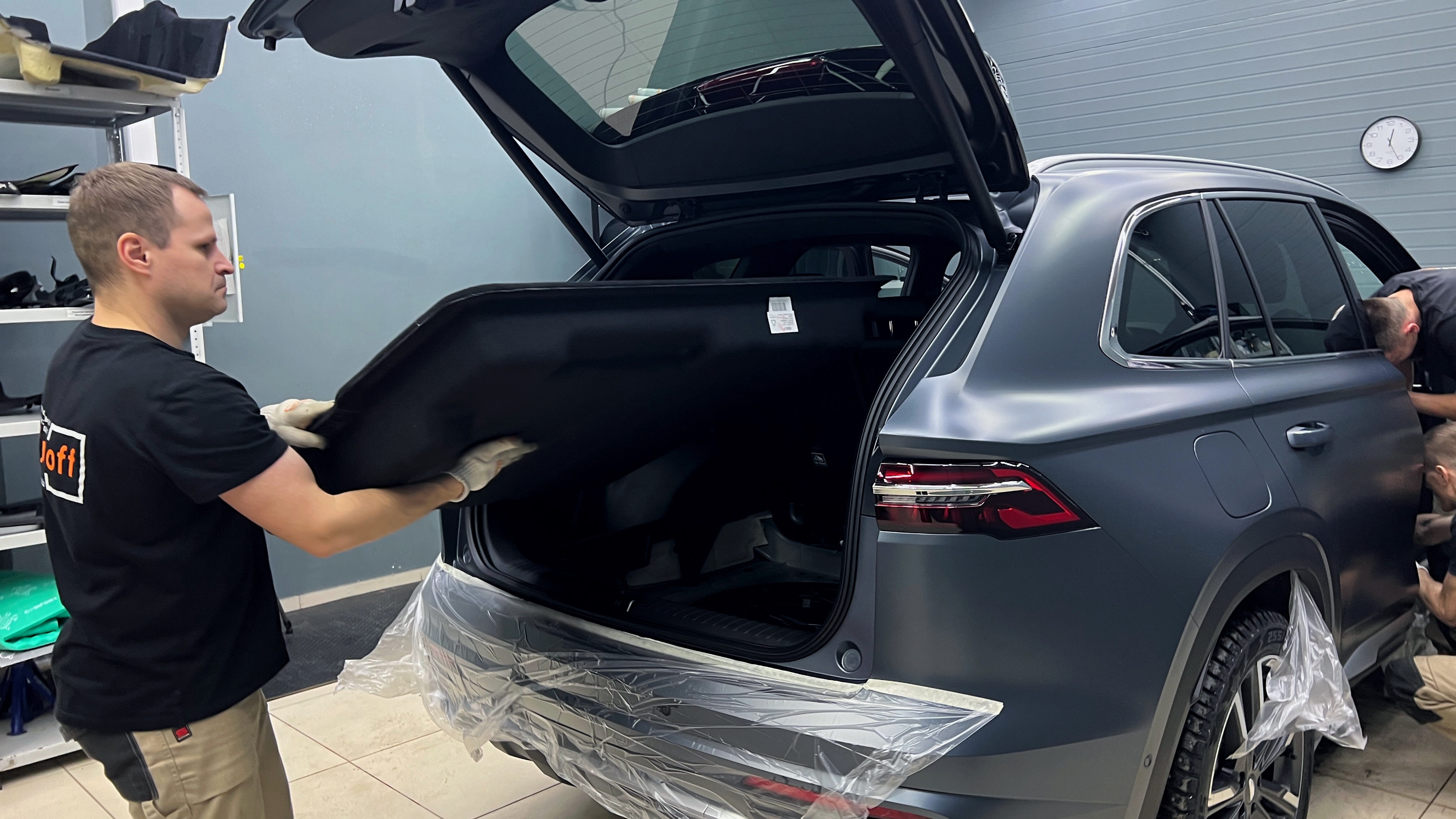 Разбор багажника Джили Монжаро Приступаем к разборке багажника. Все его части бережно складываем на стеллаж. Очищаем и обезжириваем поверхность перед оклейкой.