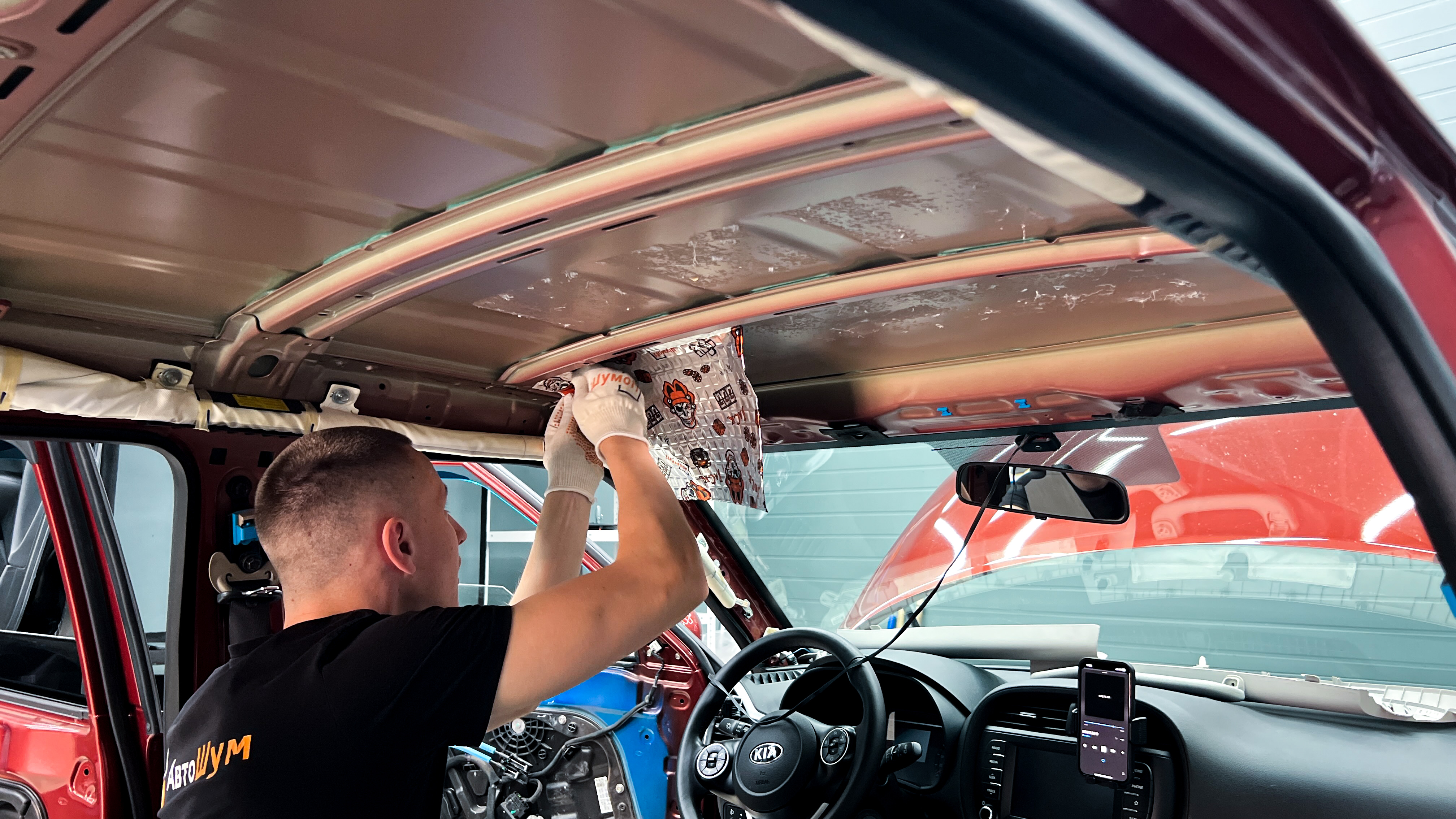 виброизоляция крыши Киа Соул В качестве первого слоя используем виброизоляцию Шумофф Jack.