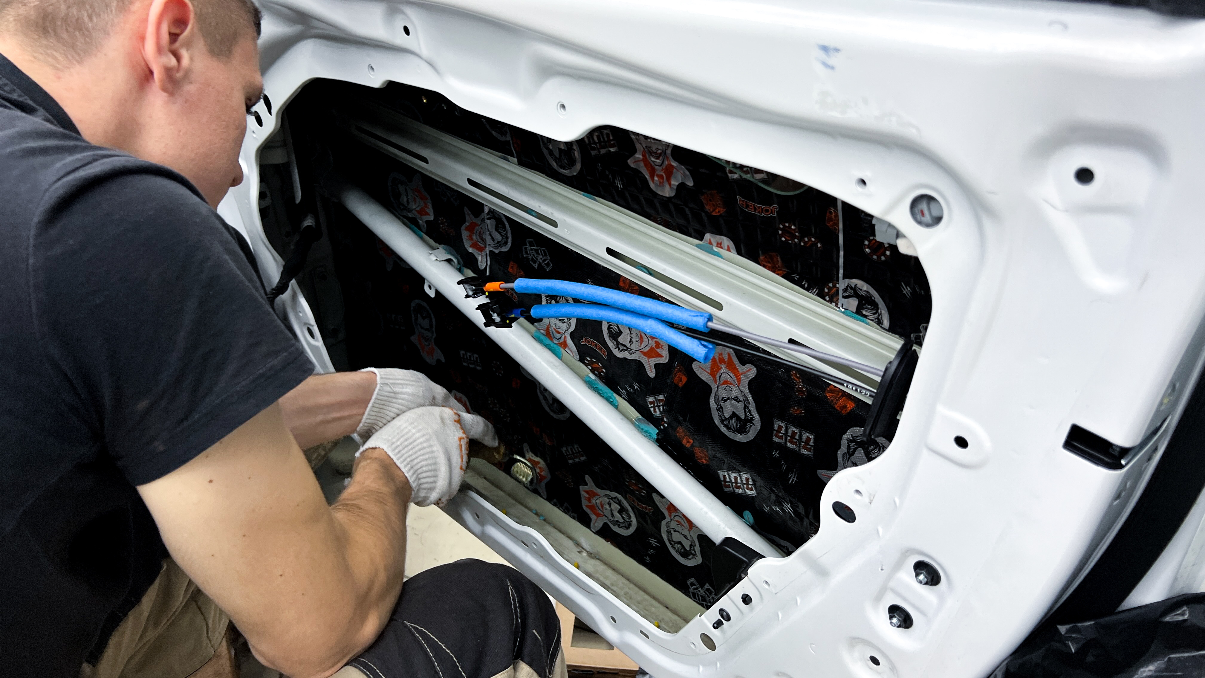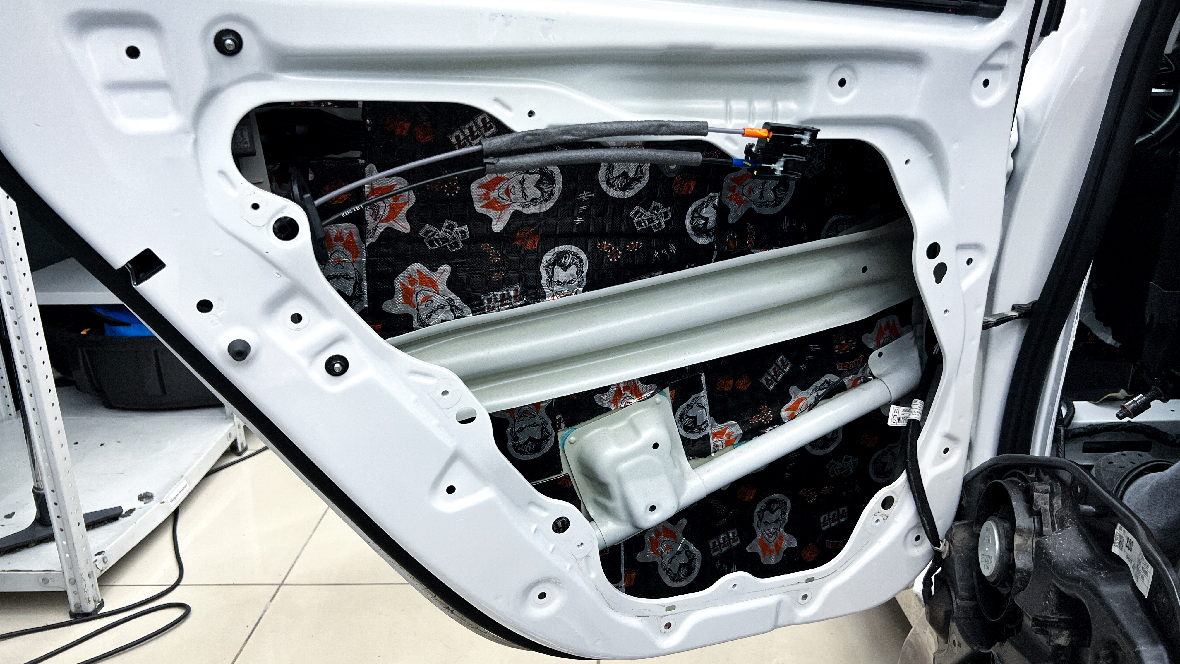 Оклеиваем всю возможную внутреннюю поверхность двери, кроме ребер жесткости. Этот слой поможет улучшить звучание даже штатной акустики, а также сделать закрывание дверей более приятным.