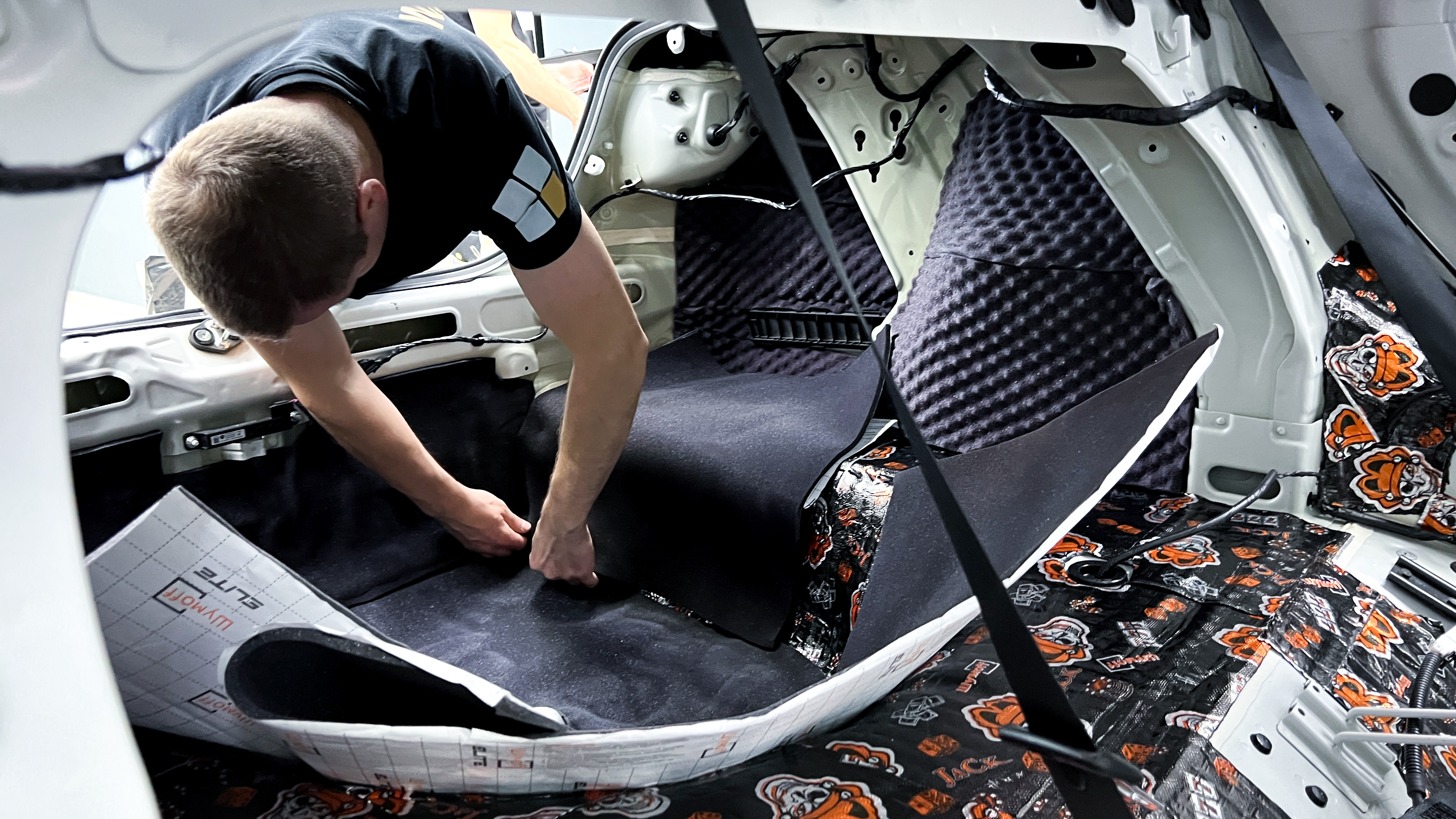 Завершаем шумоизоляцию нанесением третьего слоя звукоизоляционной мембраны Practik Finish на арки.