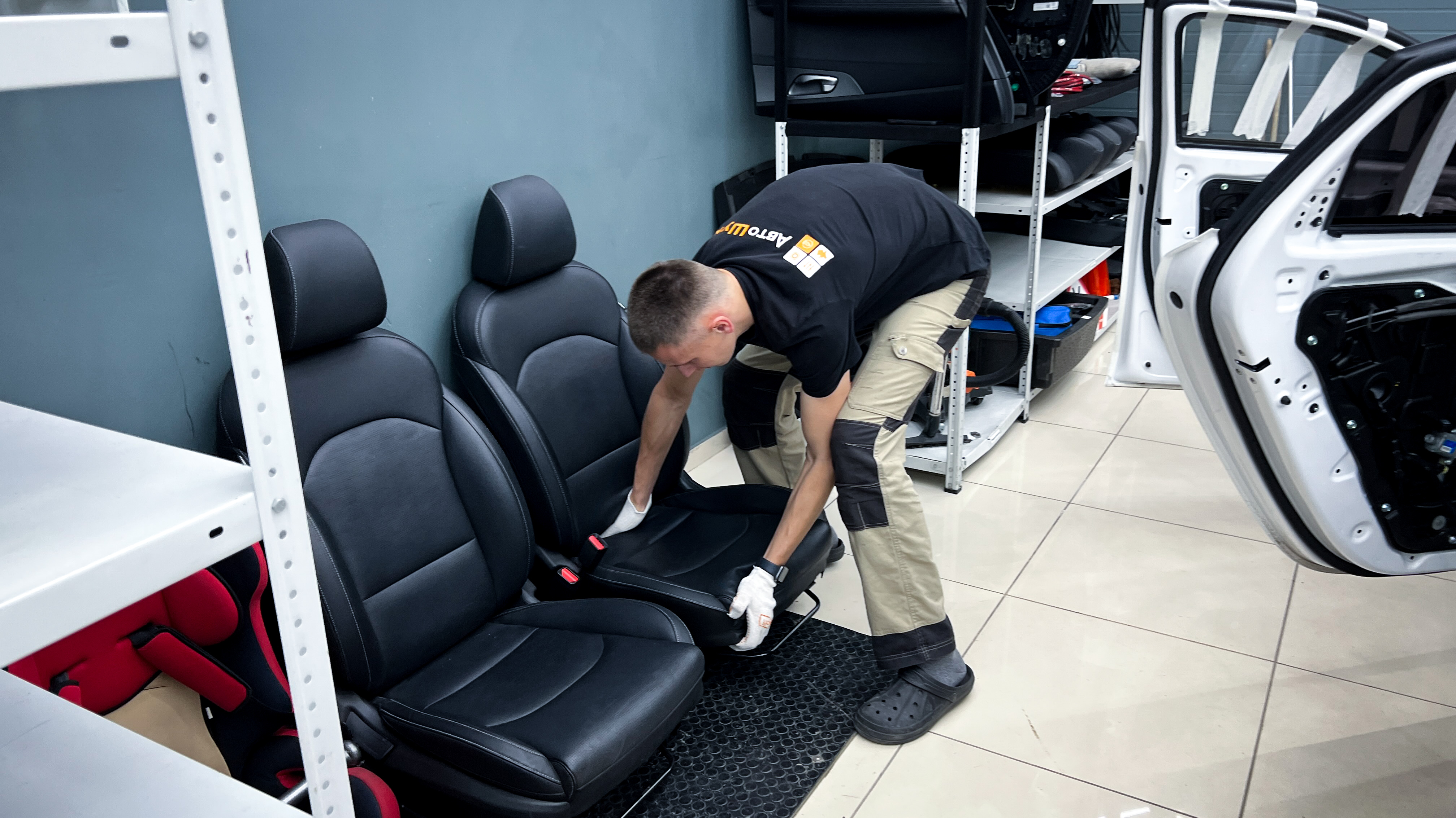 Разбор салона Киа К3 Приступаем к разбору салона: аккуратно вынимаем сиденья, среднюю консоль, обшивки и ковер и складываем все на специальный стеллаж.