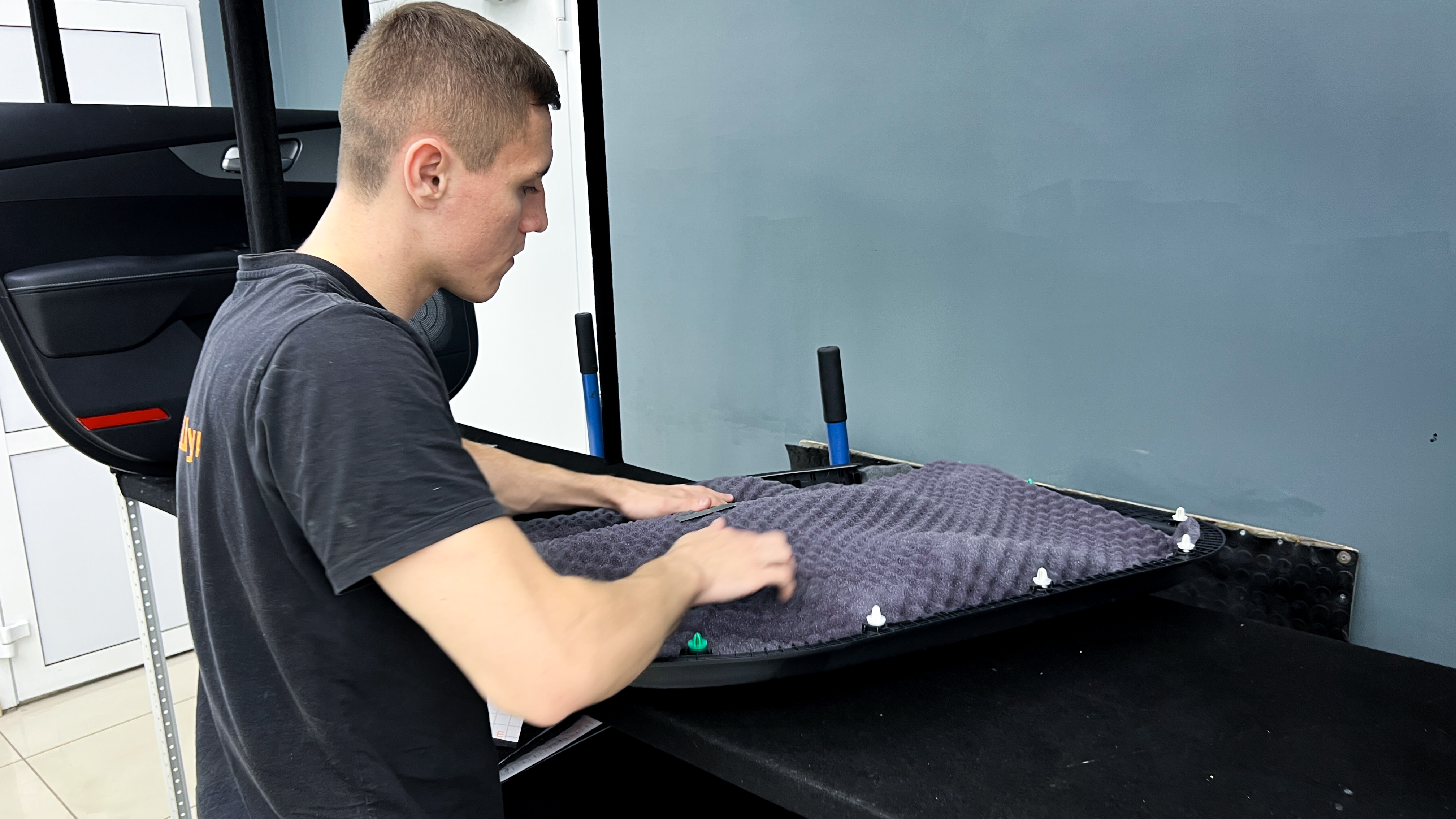 Переходим к оклейке самого корпуса панели, первым слоем частично наносим виброизоляцию Шумофф Joker, создавая тем самым идеальный баланс. Такая частичная оклейка позволит нам чрезмерно не утяжелять панель и придать ей необходимую сбитость