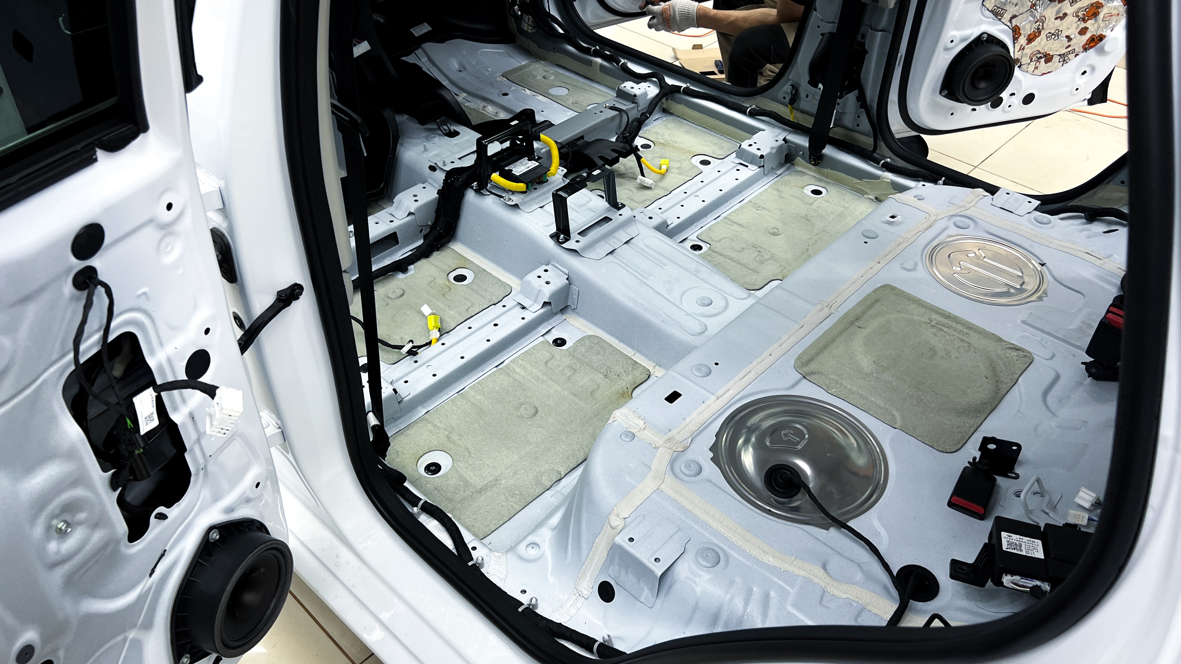 Перед началом шумоизоляции пола на Haval Jolion (Хавэйл Джолион) необходимо проверить качество адгезии заводской виброизоляции к кузову. Она должна хорошо держаться, в противном, случае её необходимо демонтировать.
