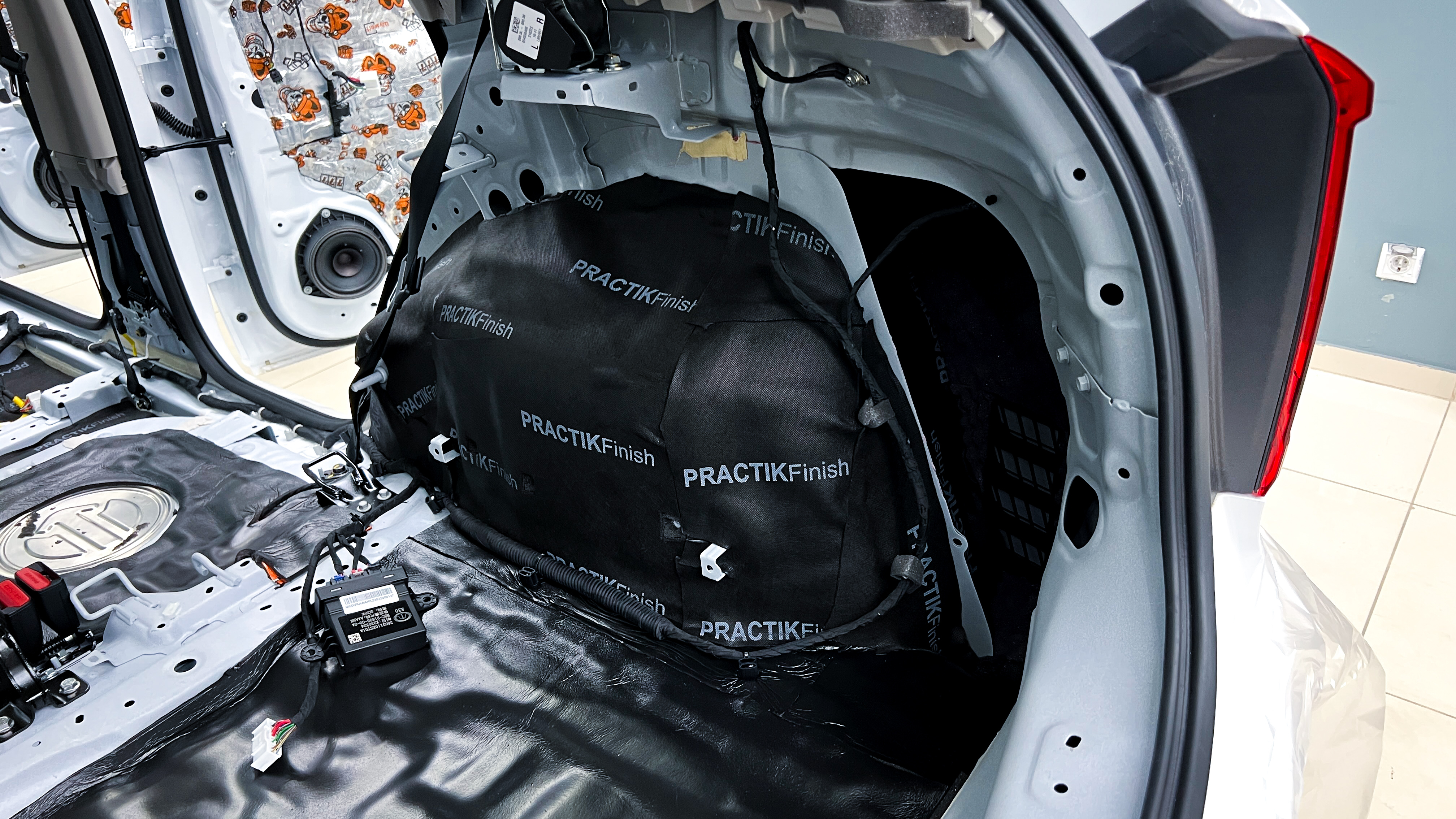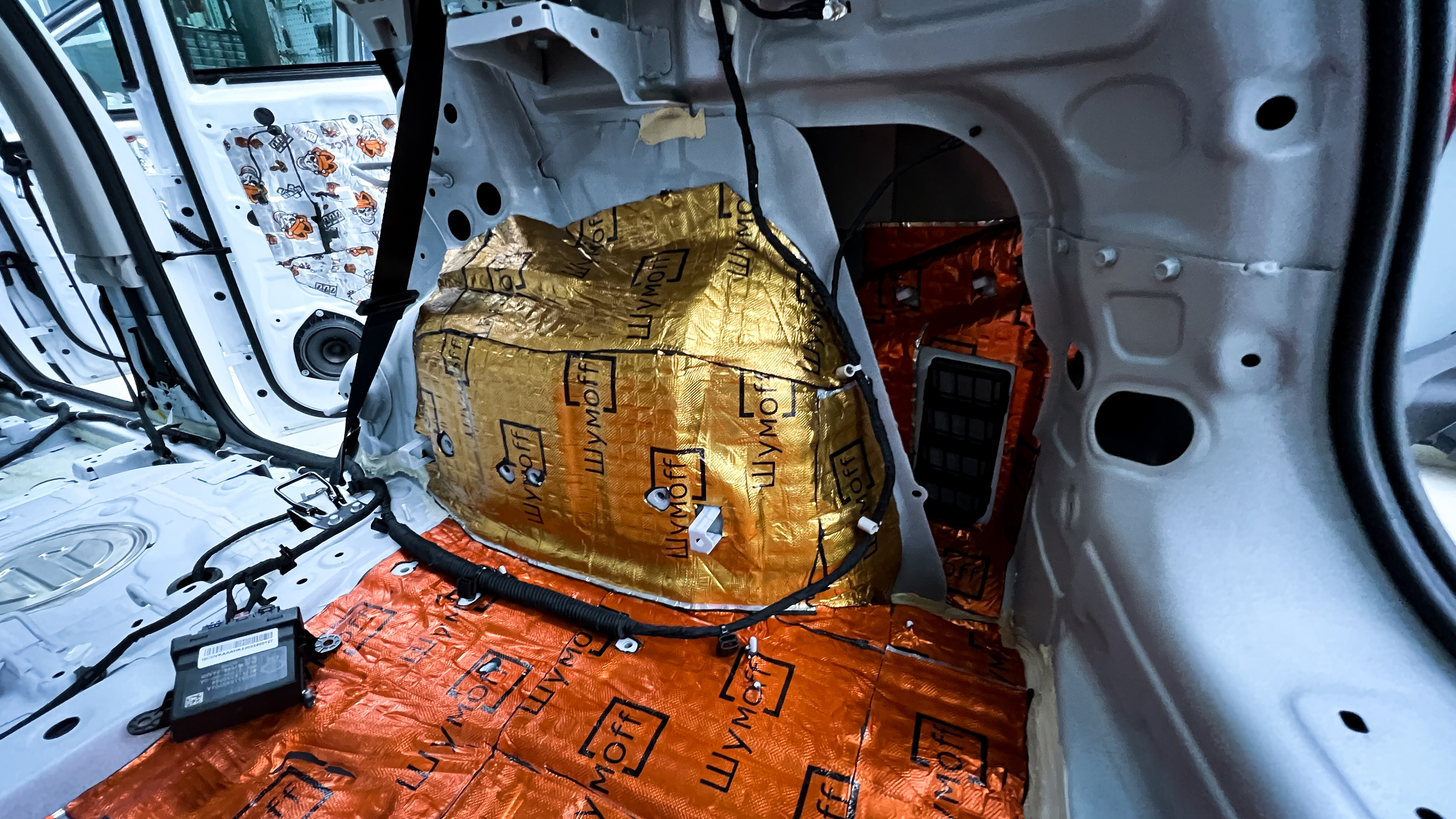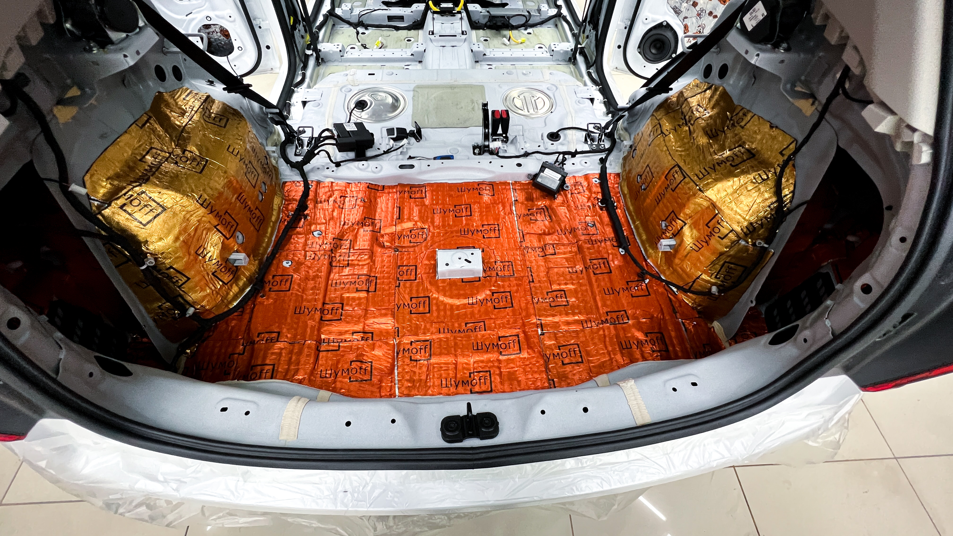 Дно багажника и крылья оклеиваются шумо и теплоизолятором Шумофф П4 4. Арки оклеиваются шумопоглотителем Flex A15.