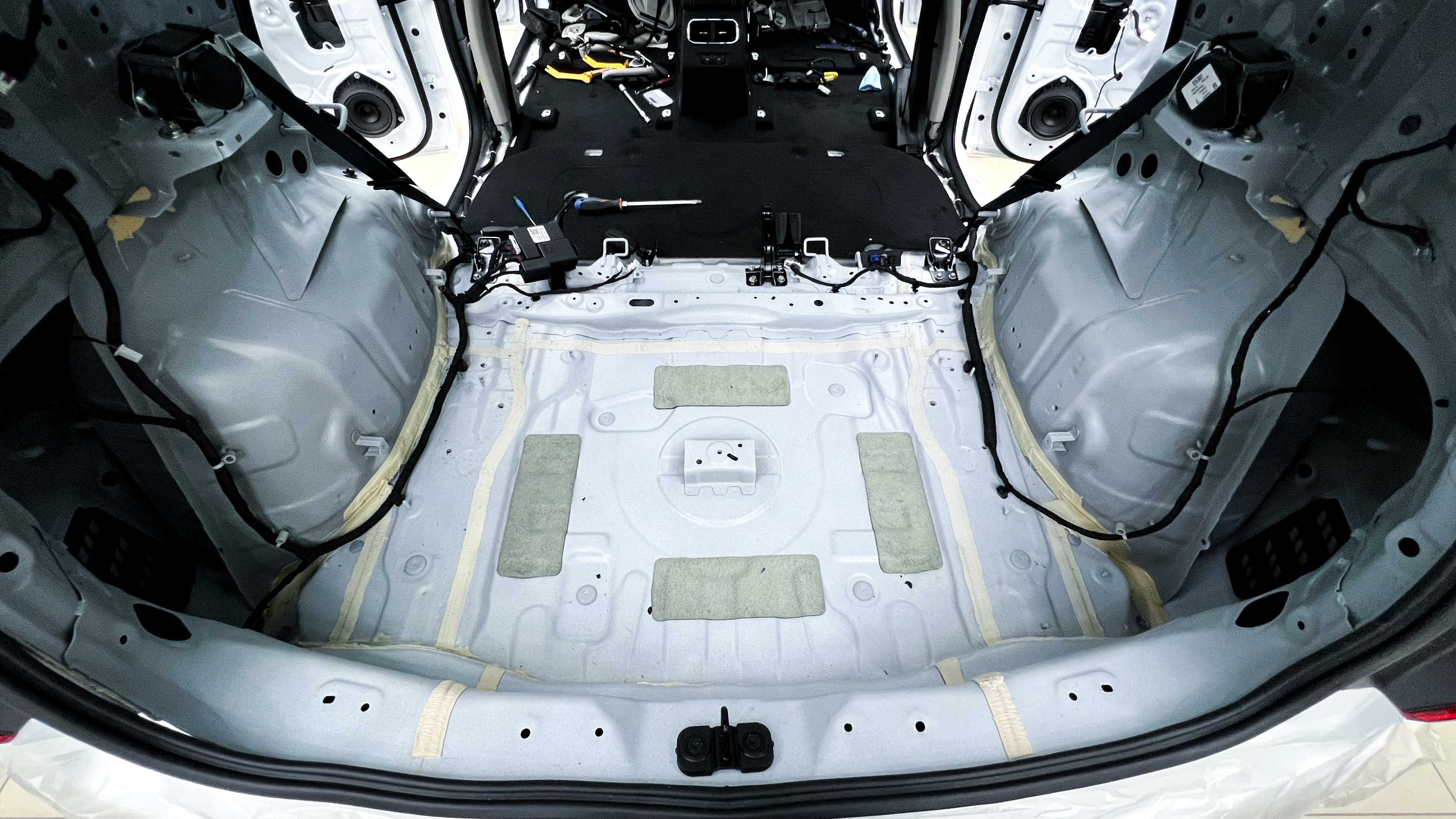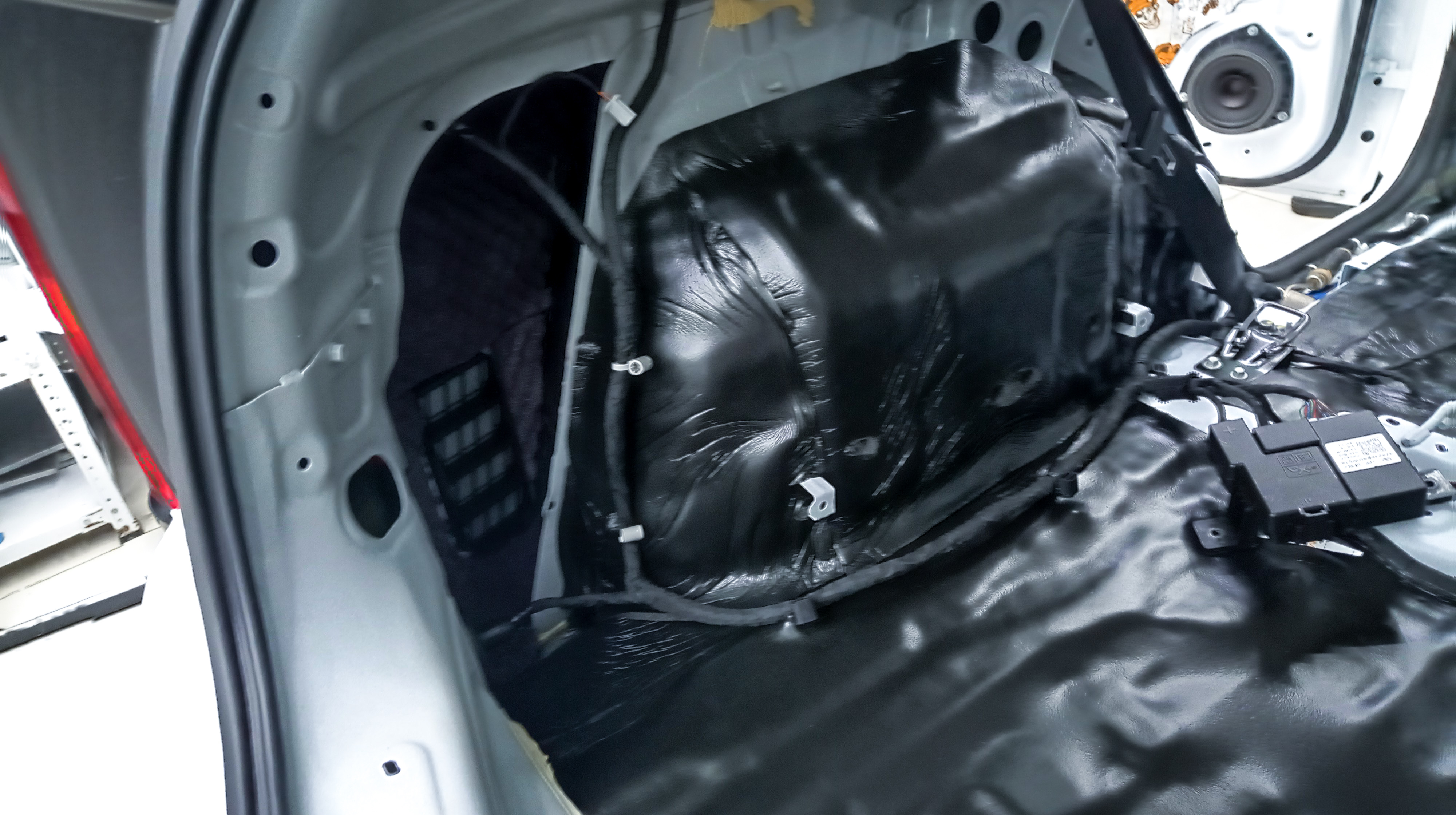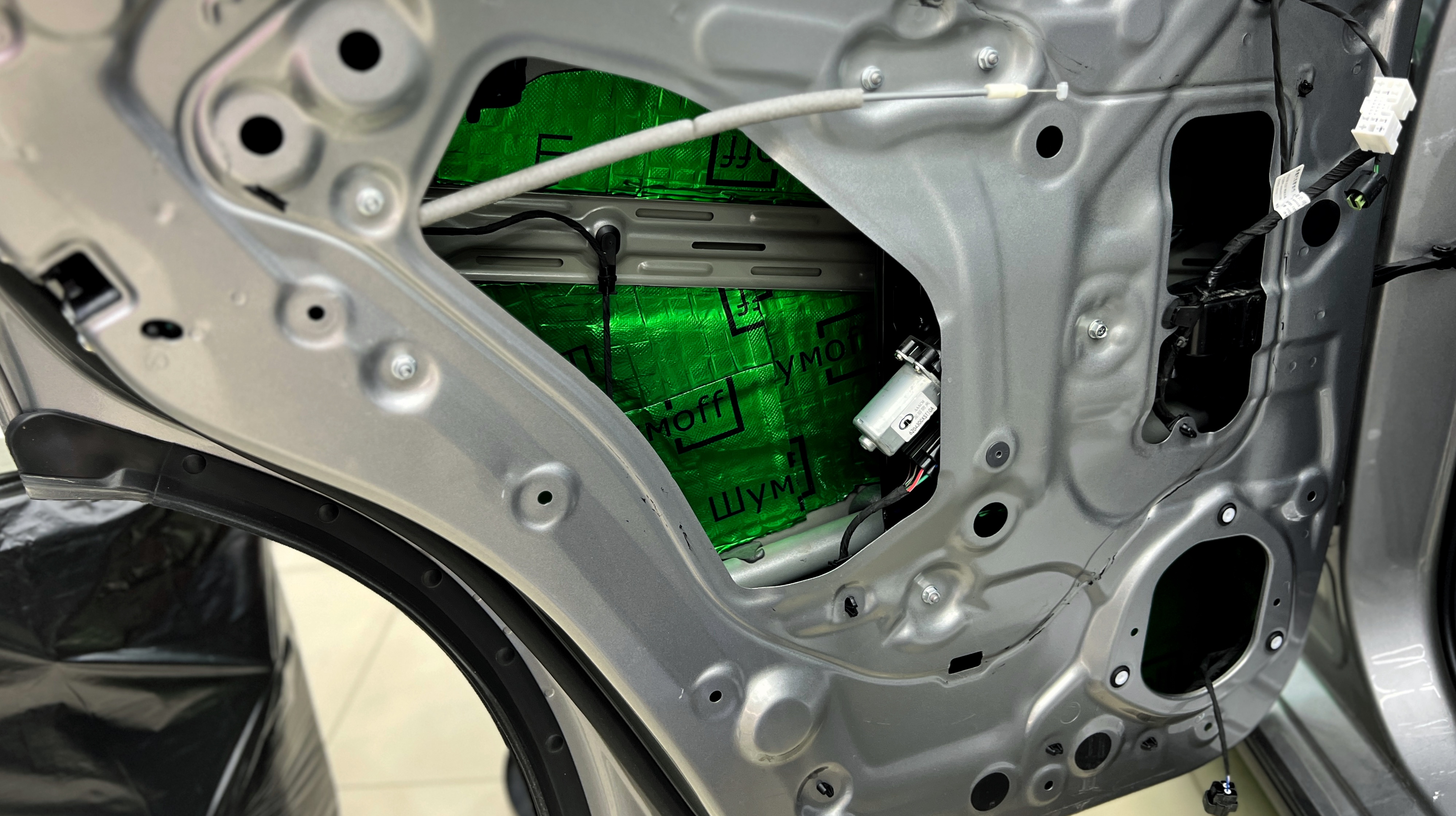 Дно багажника и крылья оклеиваются шумо и теплоизолятором Шумофф П4 4. Арки оклеиваются шумопоглотителем Flex A15.