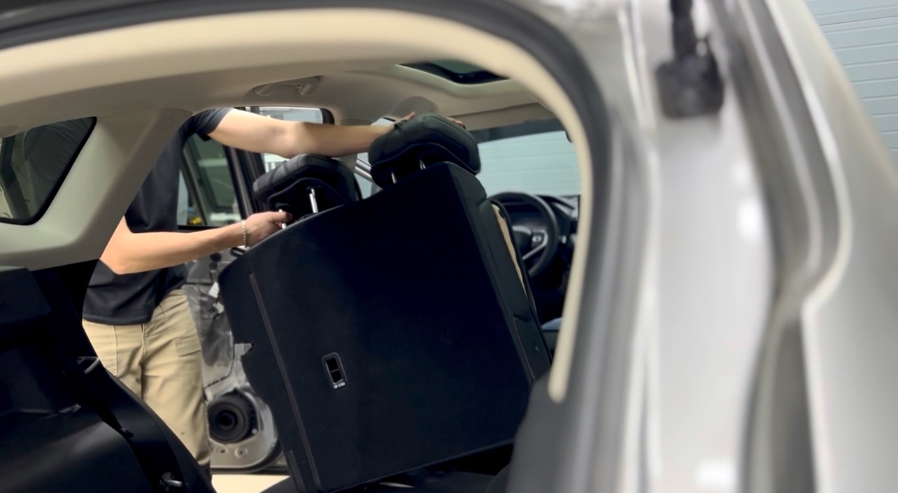 Для виброизоляции поверхности под задним сиденьем так же используем М3. Все листы берем уже заранее прогретые из специальной печки и тщательно прикатываем после монтажа.