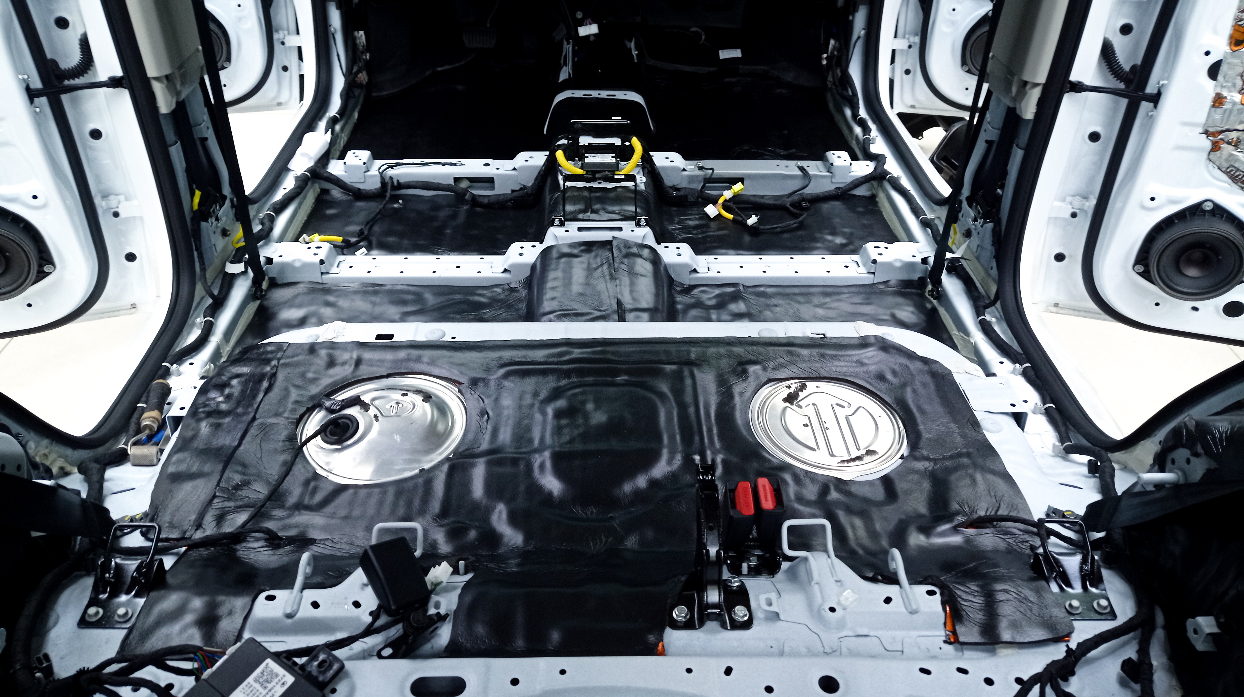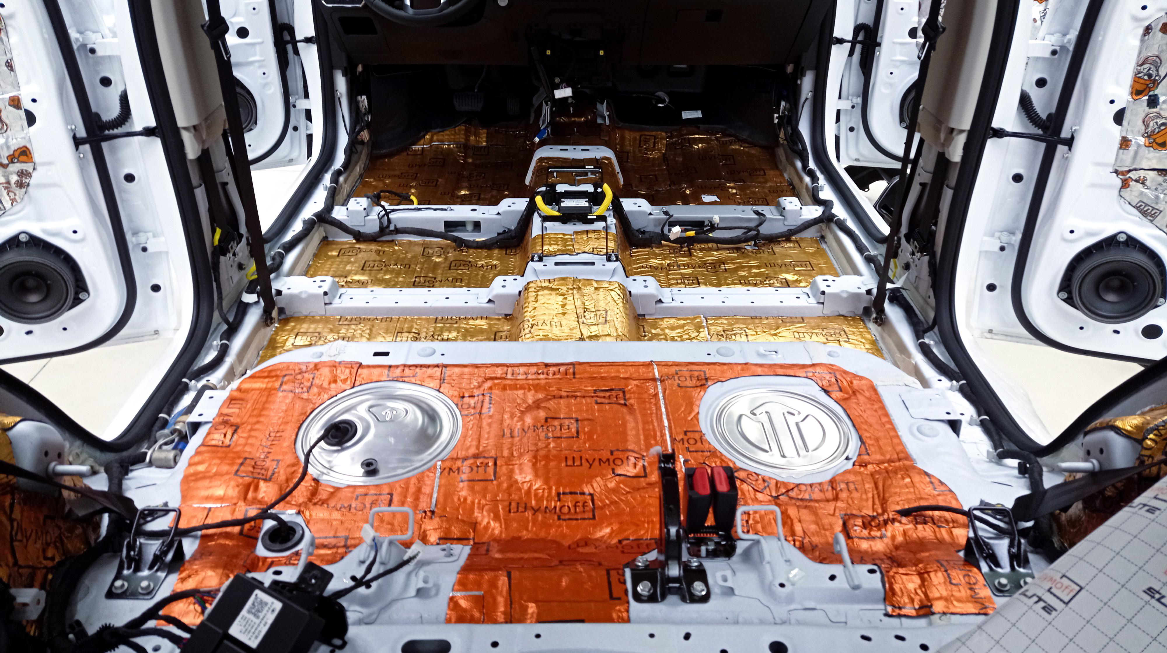 Пол от моторной перегородки и до заднего сиденья оклеивается толстой виброизоляцией Шумофф Super Jack. Под заднее сиденье клеится виброизоляция Шумофф Black Jack.