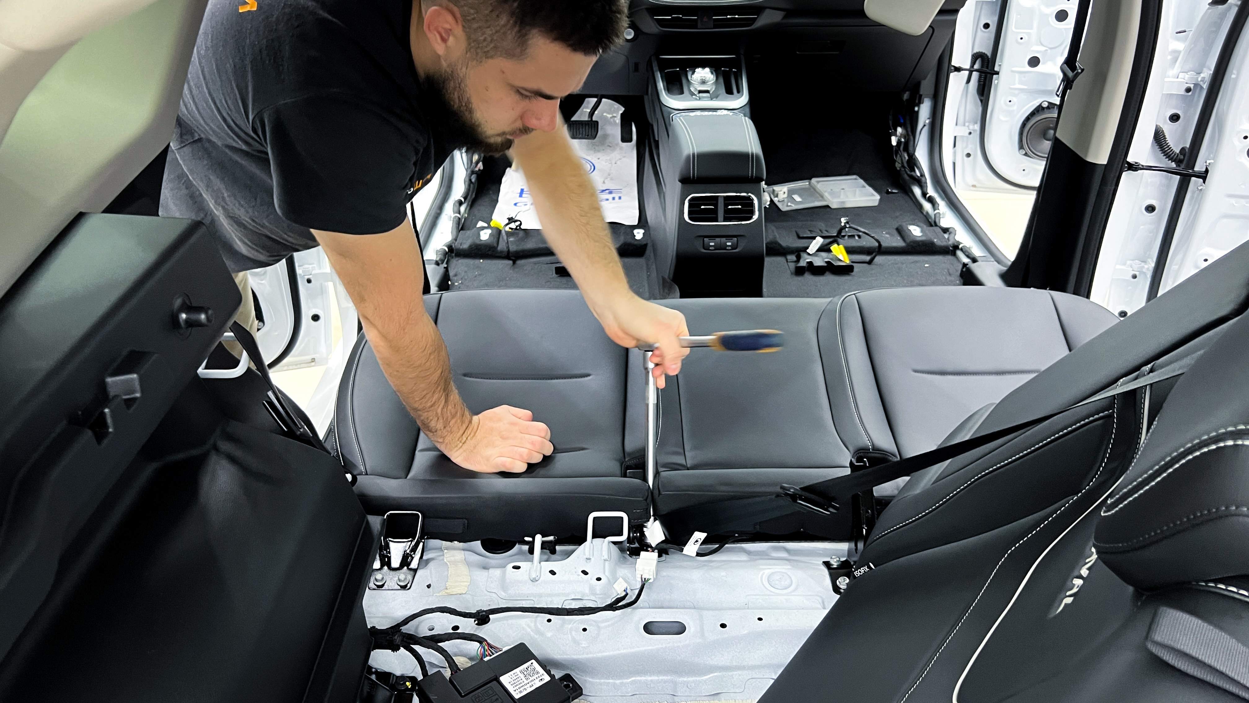 Приступаем к разборке остальной части салона, откручиваем и вынимаем сиденья, центральную консоль и ковер.