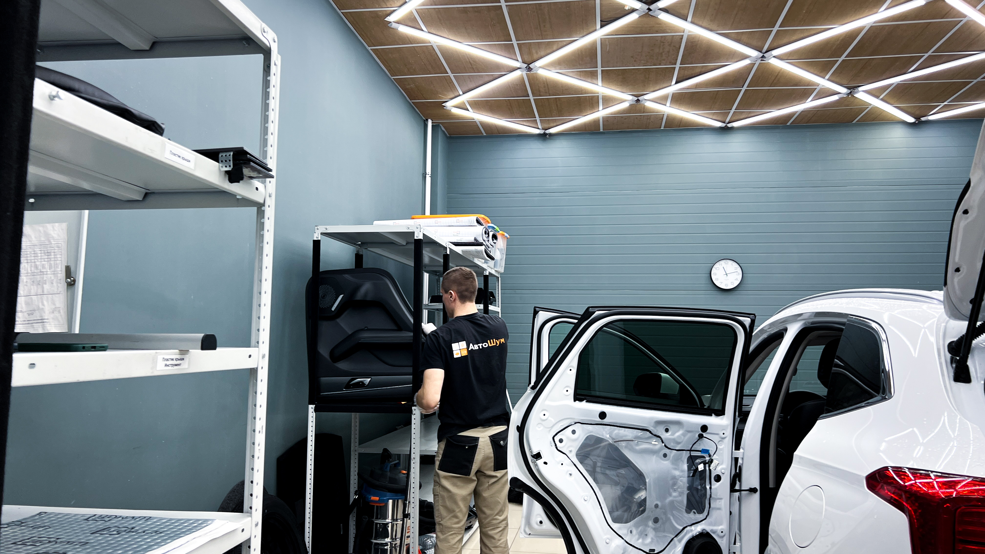 Приступаем к разбору салона: аккуратно вынимаем сиденья, среднюю консоль, обшивки и ковер и складываем все на специальный стеллаж