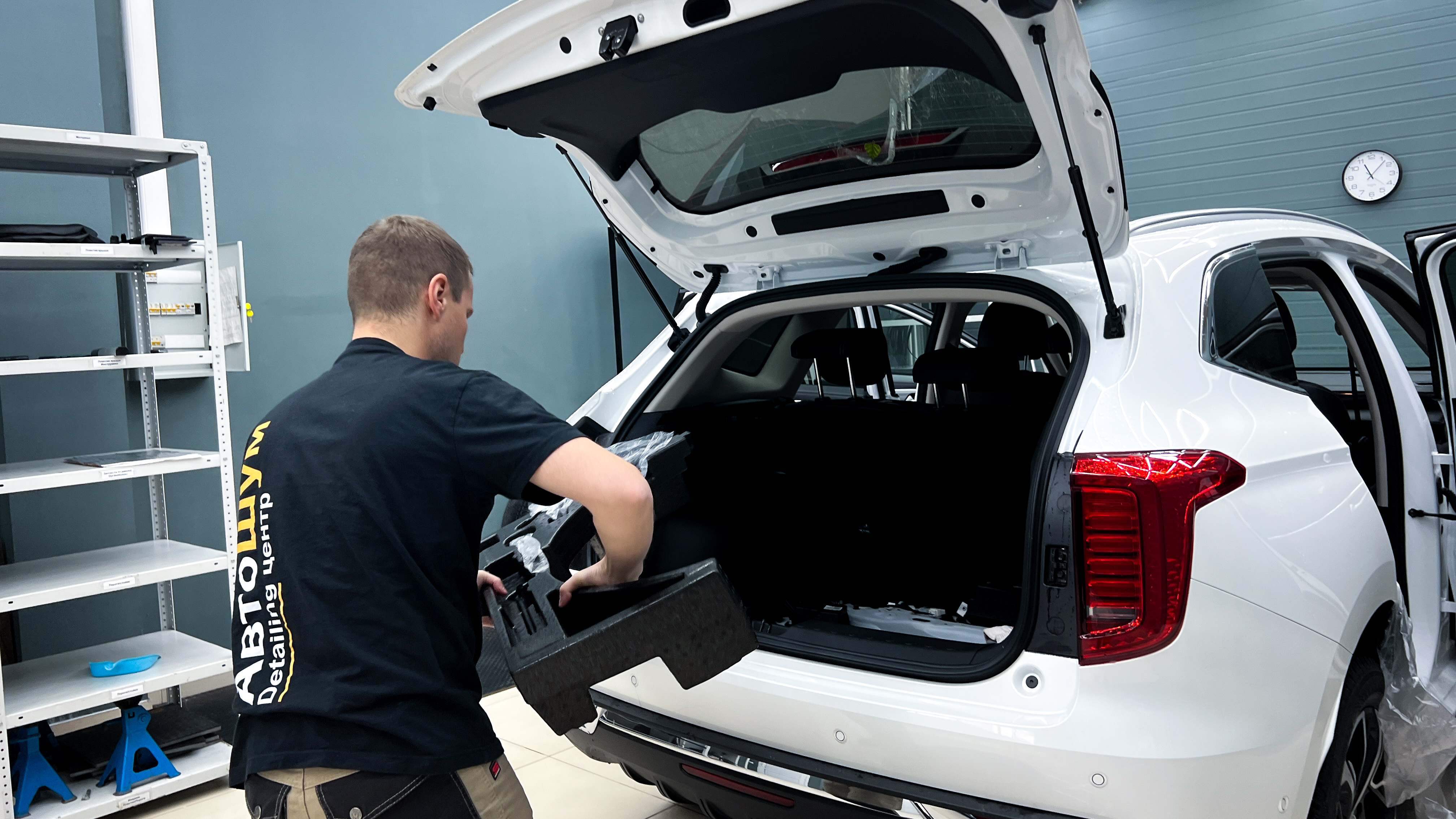 Обезжириваем поверхность и приступаем к монтажу второго слоя. Также для получения более эффективного результата используем компоновку из двух материалов На дно багажника клеим Шумофф Base 4. Этот слой позволит снизить нам шум от дороги.