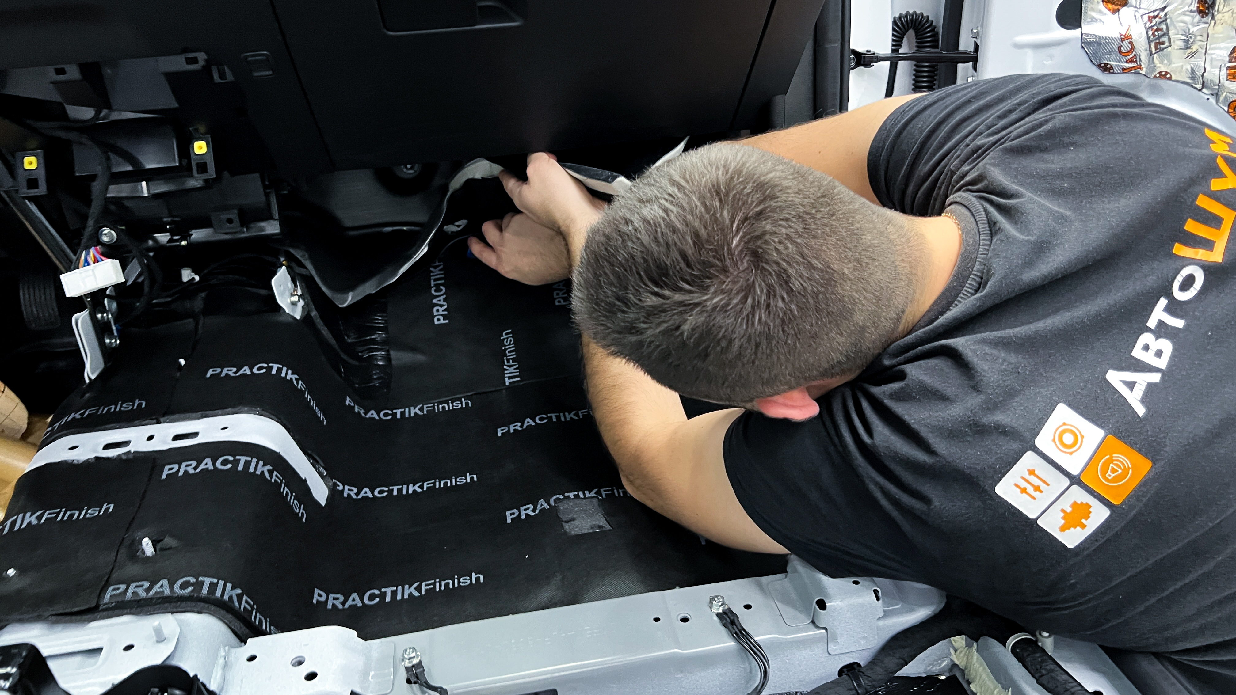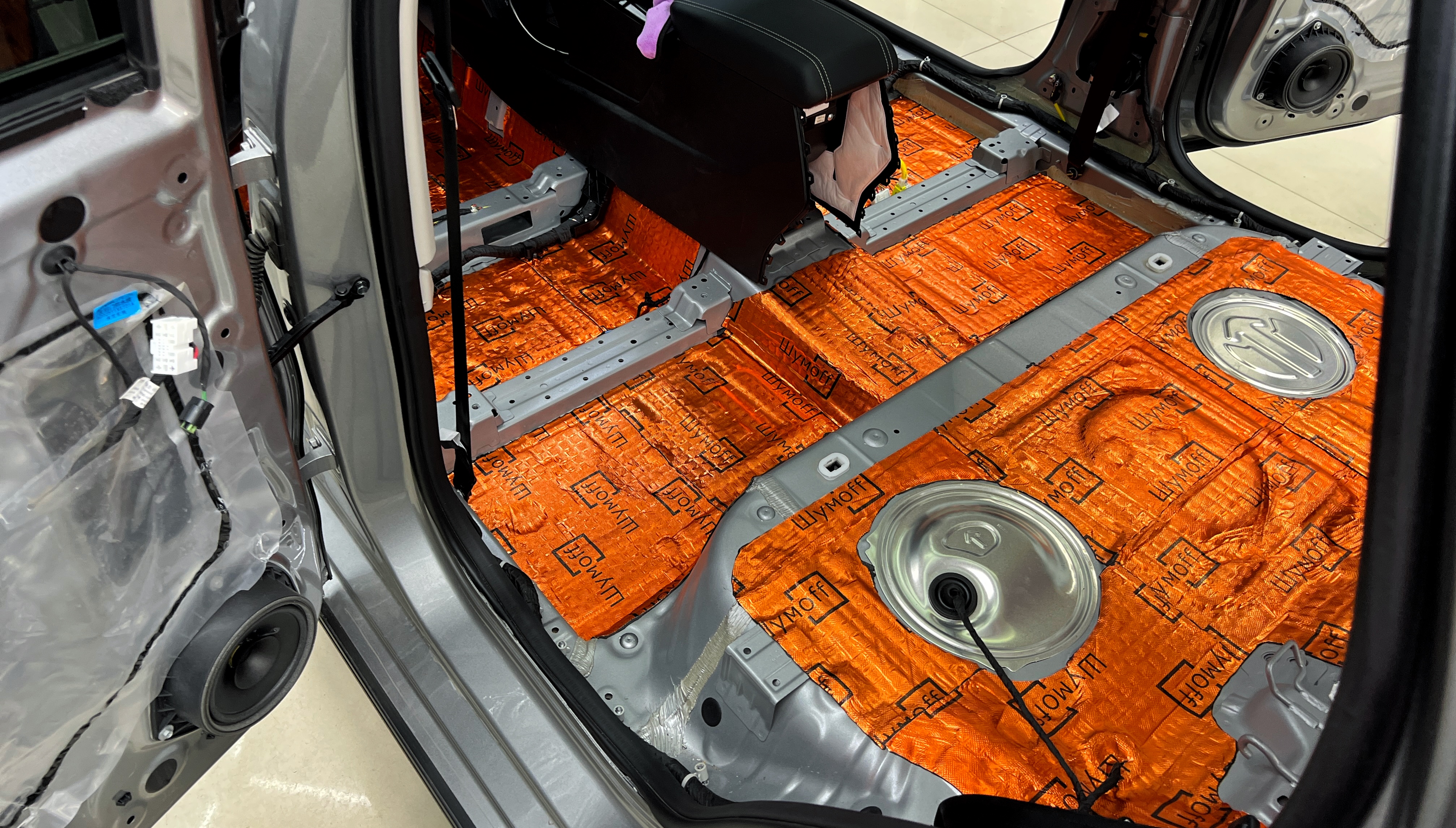 От моторной перегородки и до заднего сиденья вмести с ним клеится мощный многослойный шумо и звукоизолятор Шумофф Prizma 6.