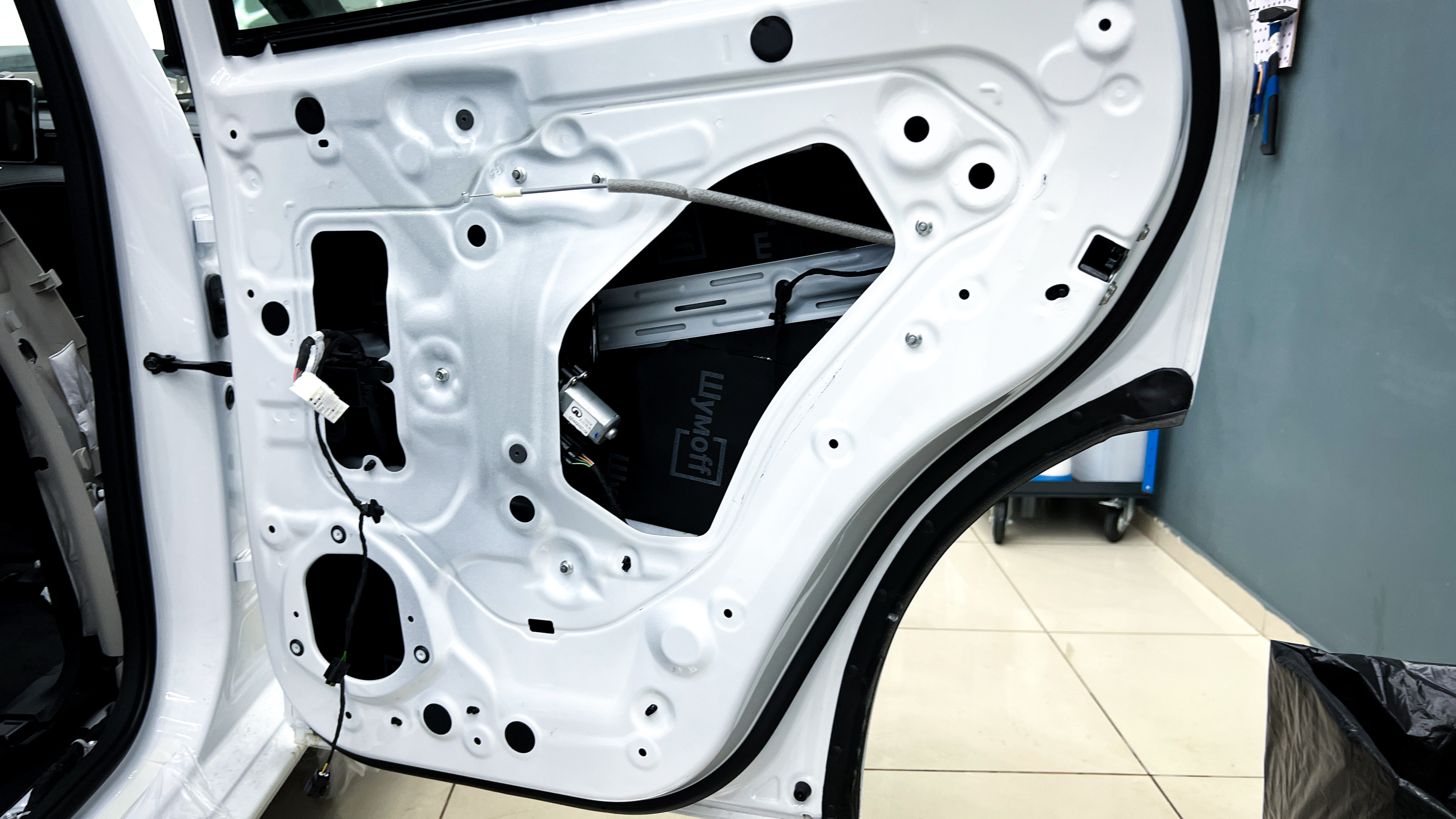 Снимаем дверную обшивку и убираем ее на специальный стеллаж для всего салона. Удаляем влагозащитную пленку с двери и приступаем к обезжириванию всех поверхностей двери перед нанесением материалов.