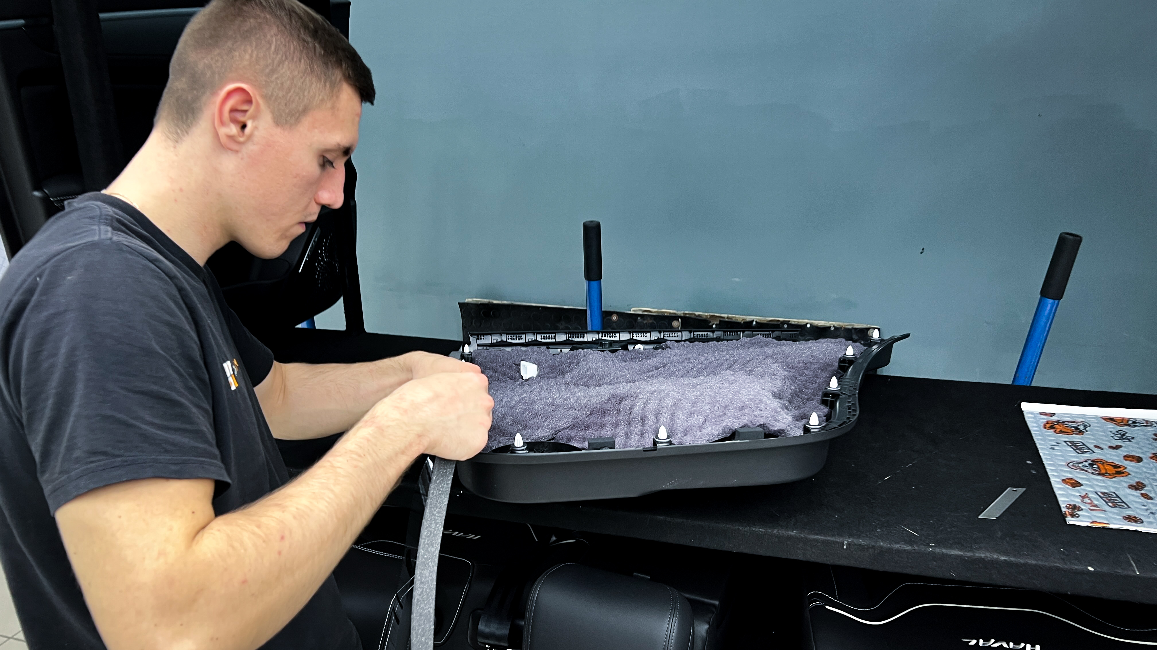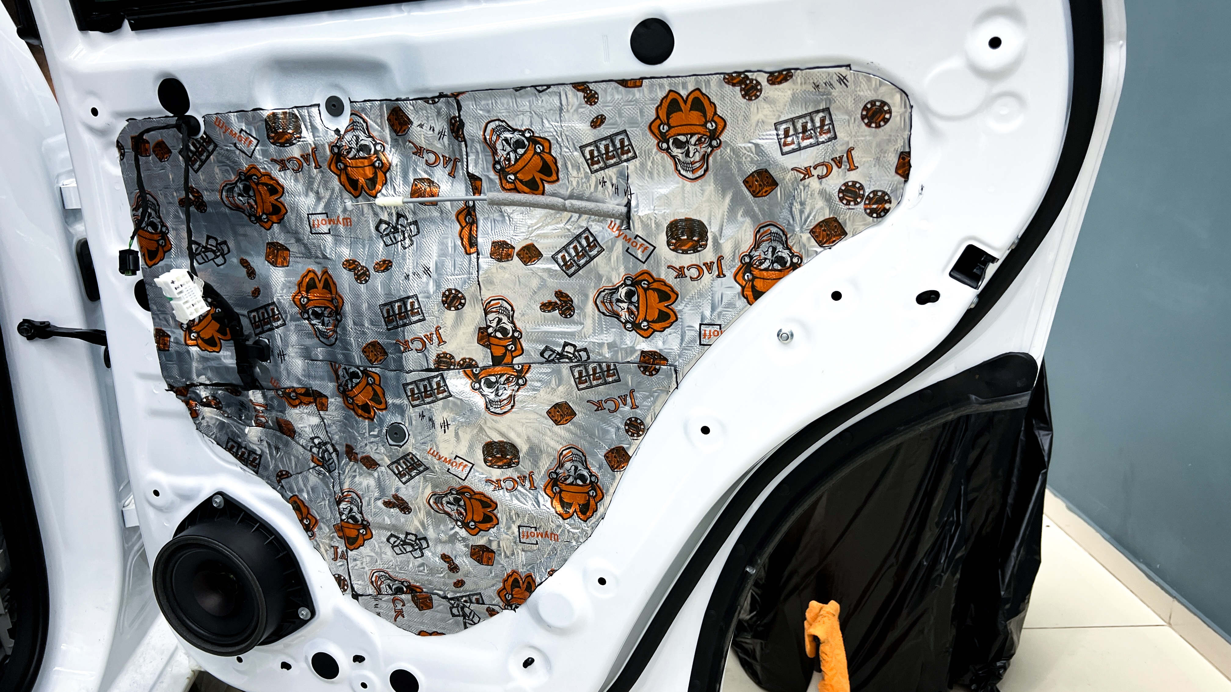 Переходим к оклейке самого корпуса панели, первым слоем частично наносим виброизоляцию Шумофф Joker, создавая тем самым идеальный баланс. Такая частичная оклейка позволит нам чрезмерно не утяжелять панель и придать ей необходимую сбитость