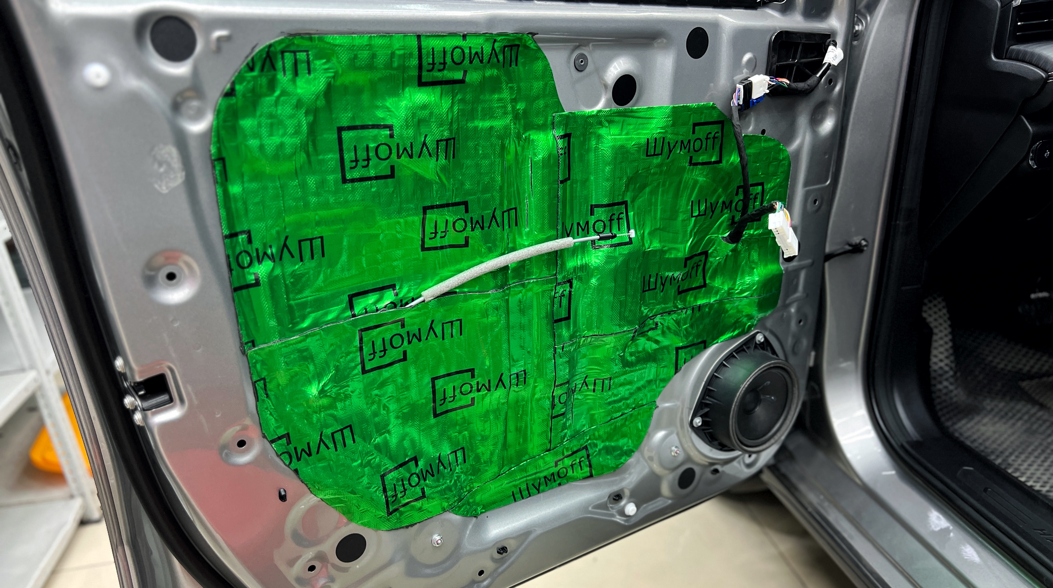 Первым слоем на внутреннюю часть двери клеим виброизоляцию Шумофф М2. Этот слой поможет нам улучшить звучание акустики, а также сделать закрывание дверей более приятным.