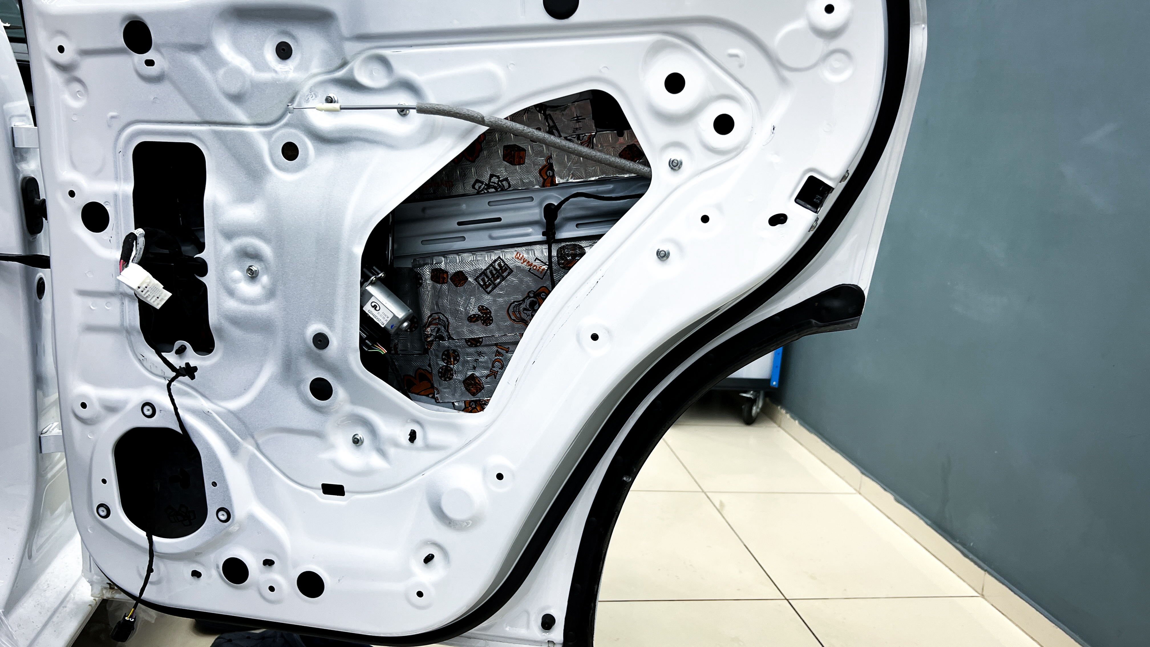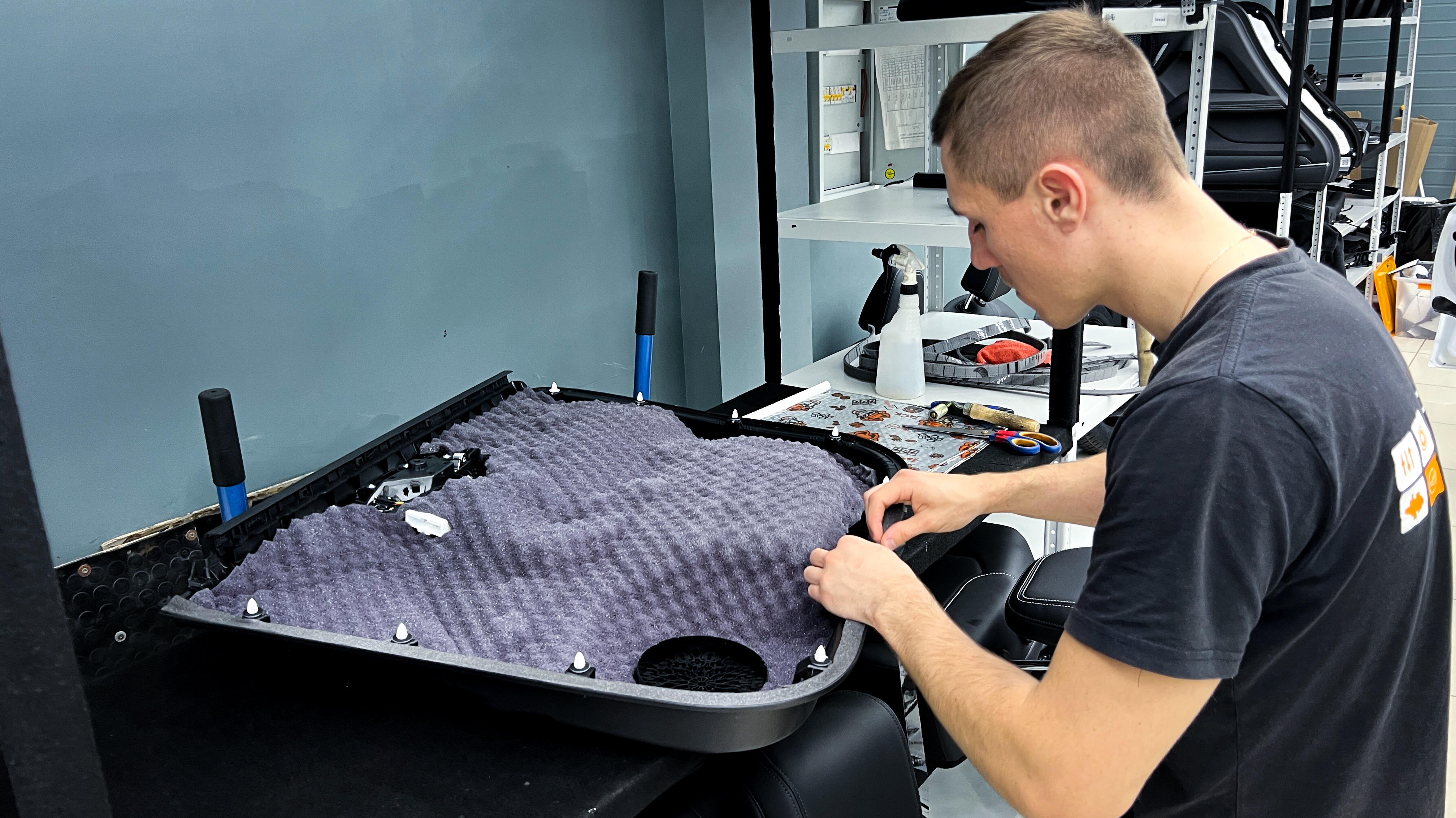 Внутренняя поверхность обивки оклеивается шумопоглотителем Flex А15.