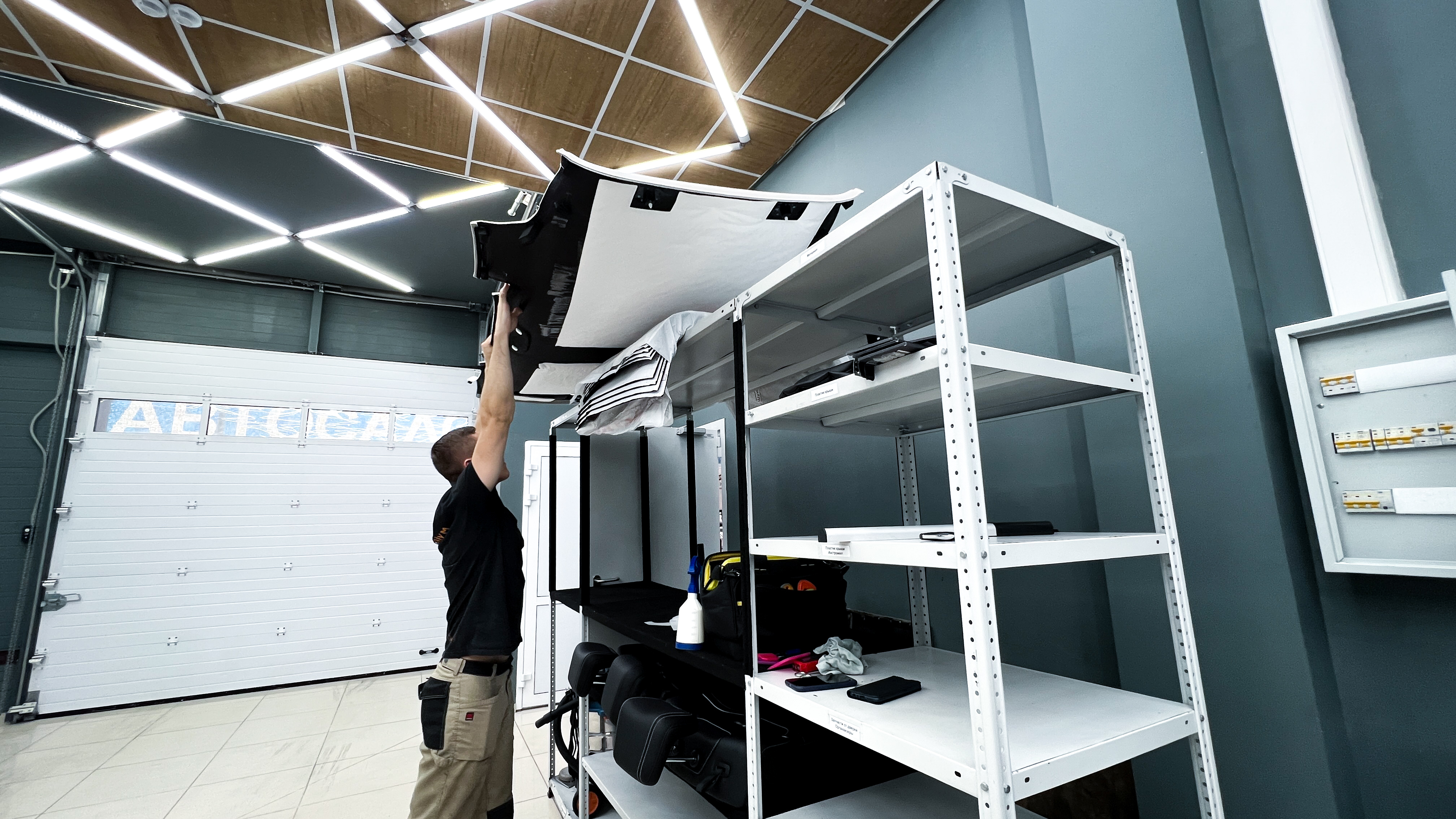 Аккуратно демонтируем обшивки и складываем их на специальный стеллаж, чтобы не повредить. Очищаем и обезжириваем.