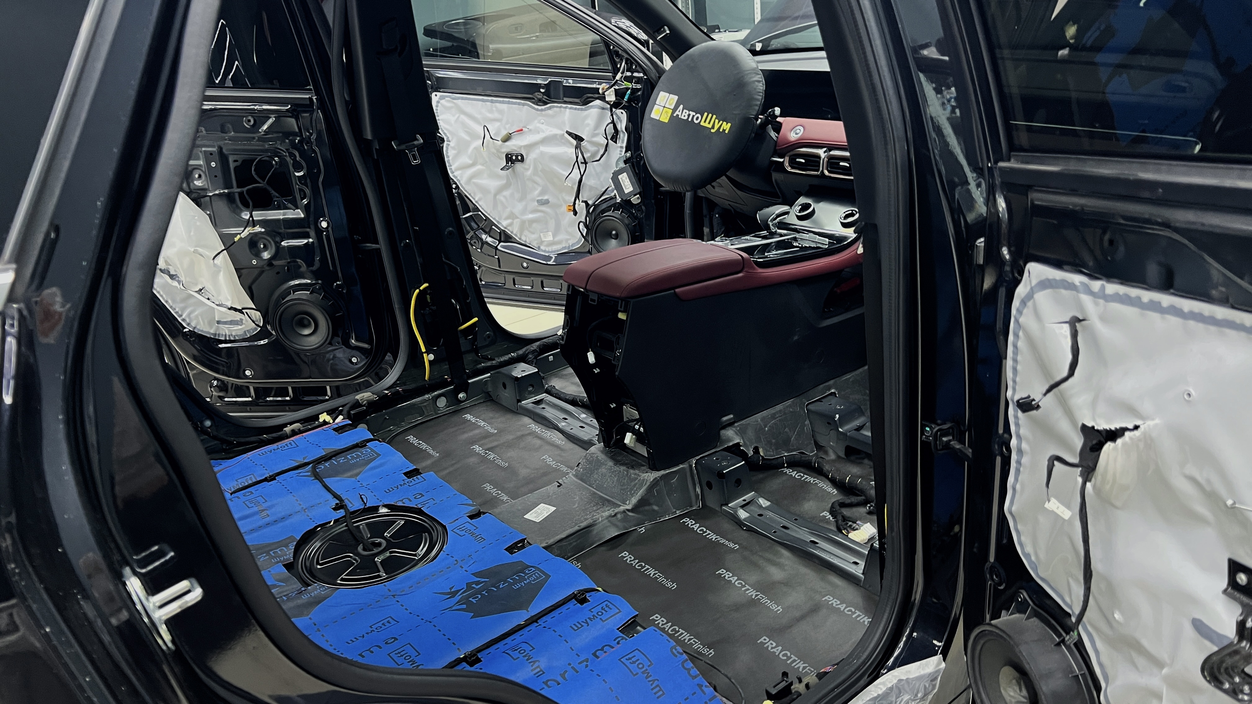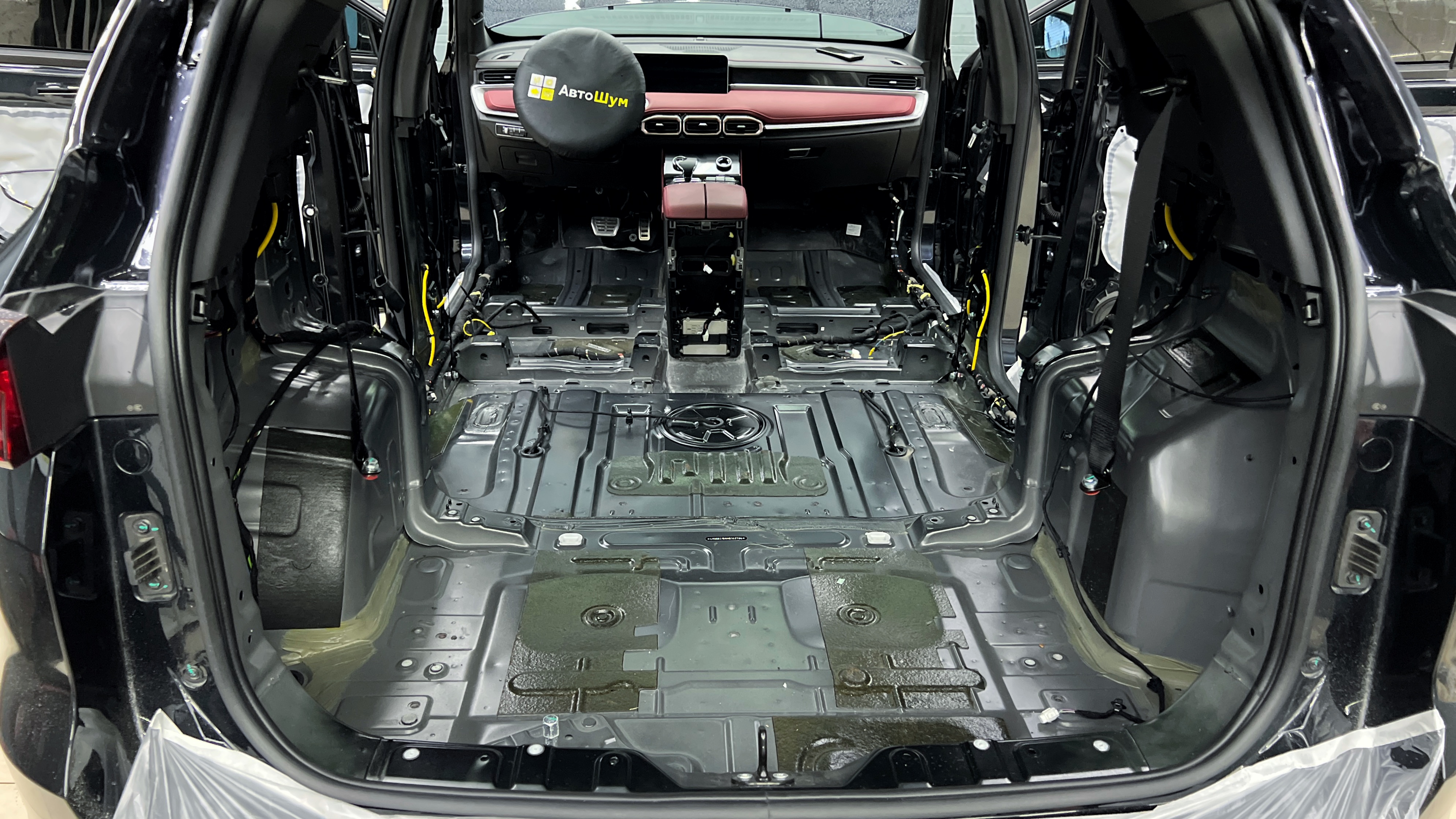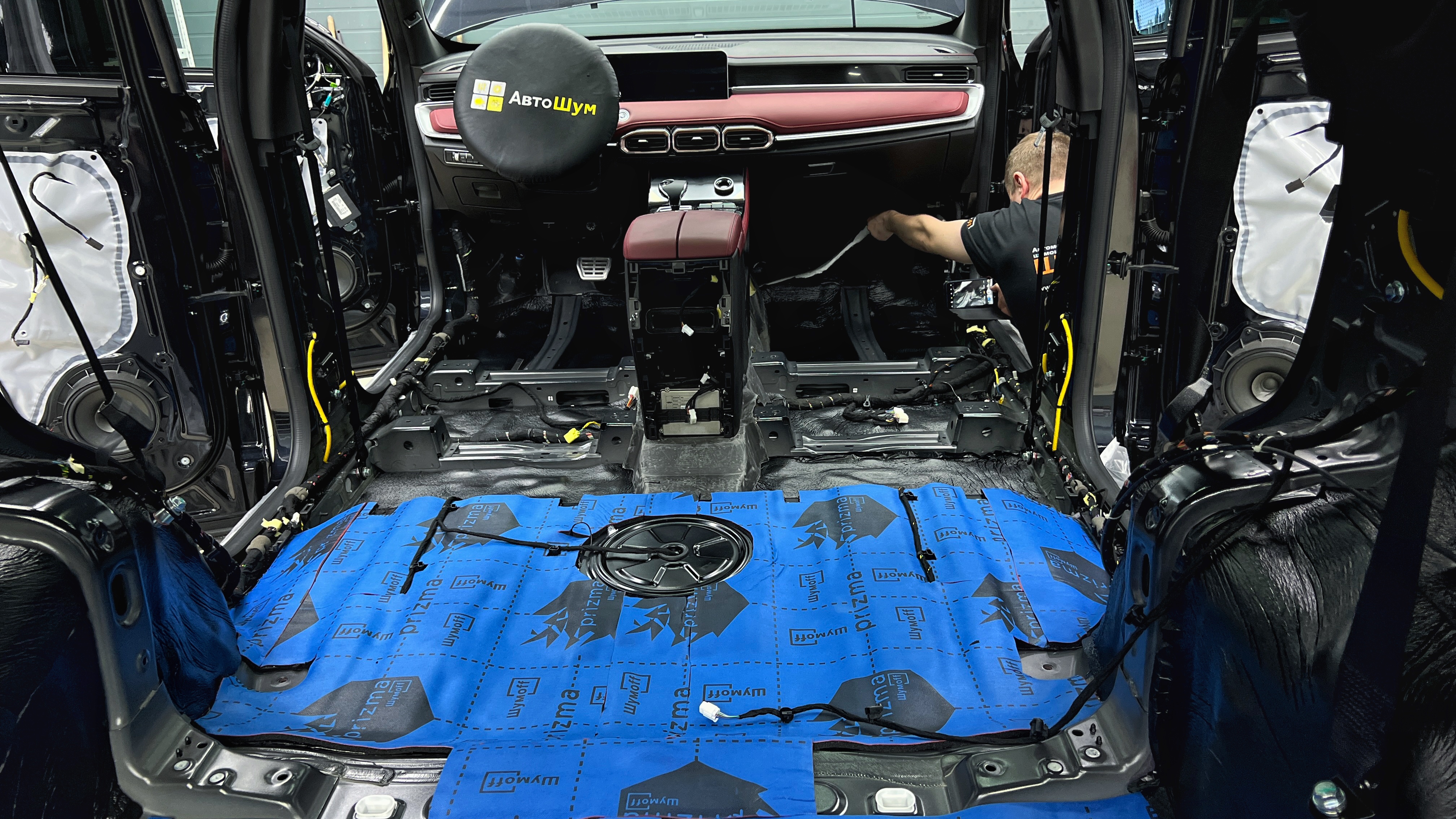 От моторной перегородки и до заднего сиденья вмести с ним клеится мощный многослойный шумо и звукоизолятор Шумофф Prizma 6.