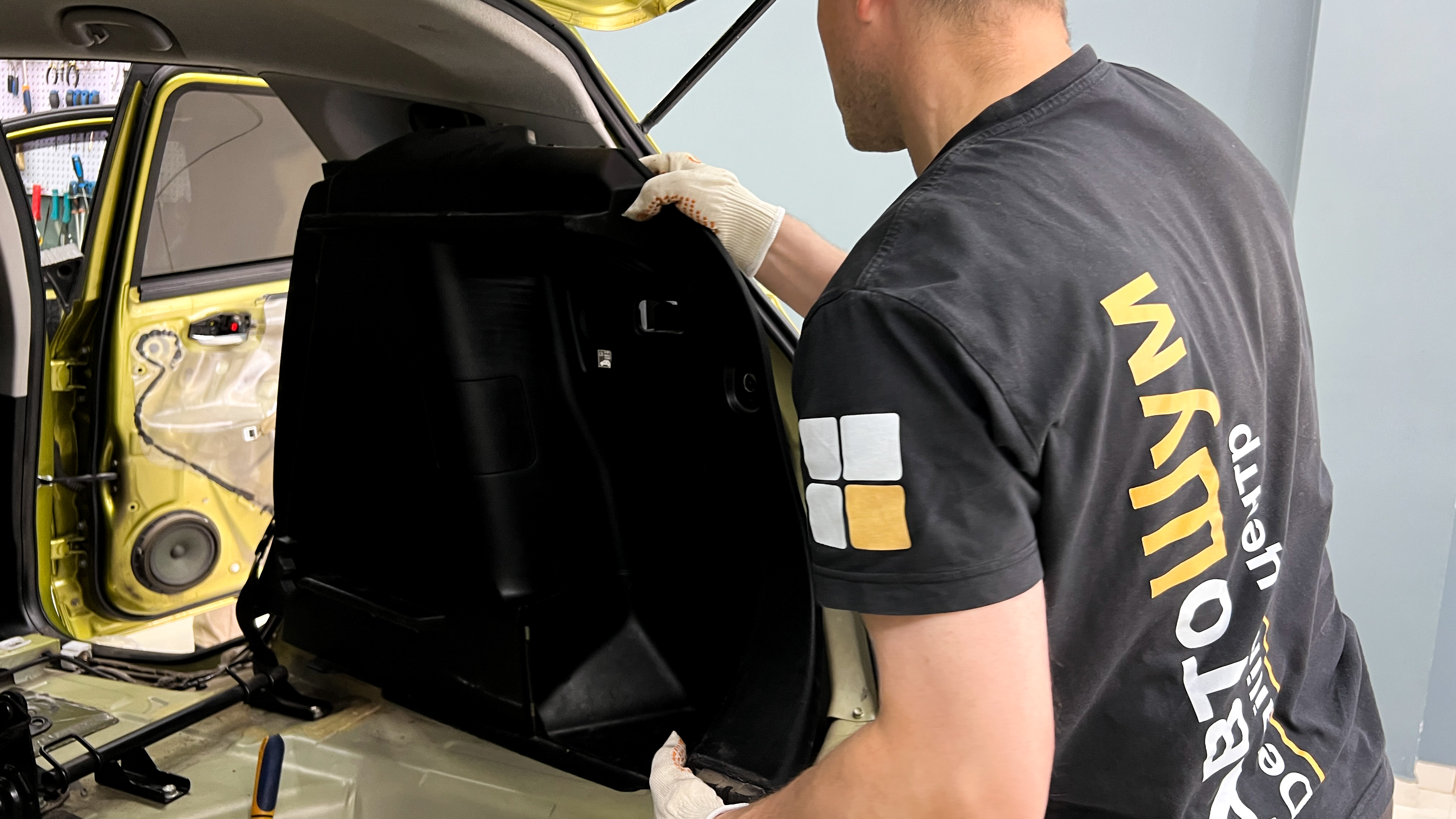 - все дно багажника и крылья оклеиваем мене толстым и тяжелым Шумофф М3.