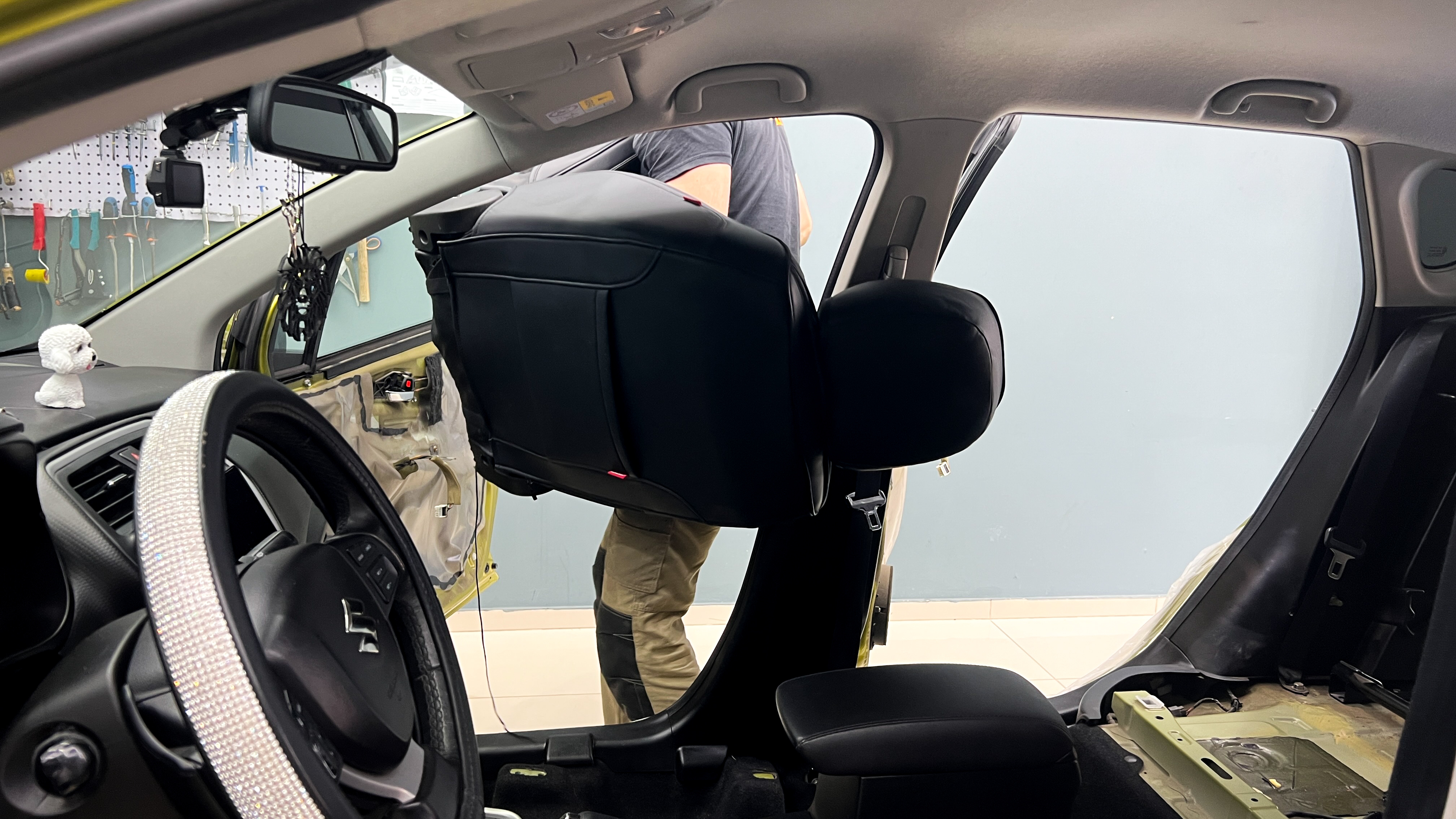 Приступаем к разборке остальной части салона, откручиваем и вынимаем сиденья, центральную консоль и ковер.
