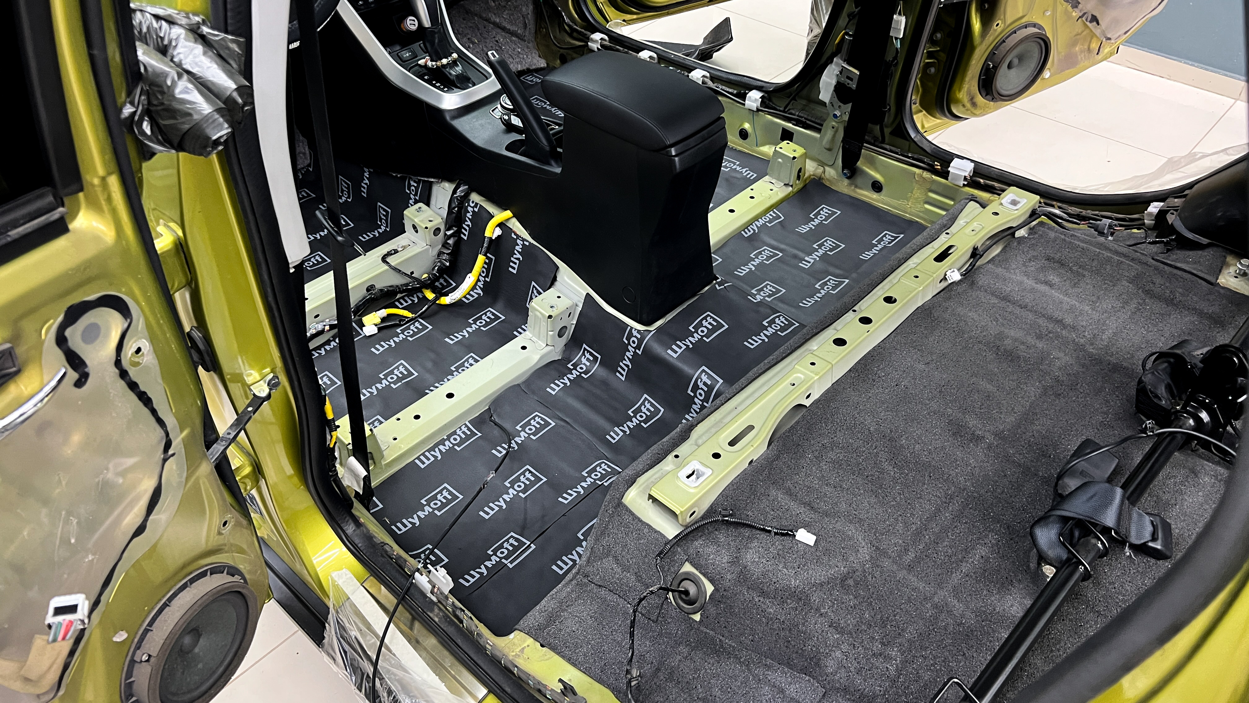 Дно оклеивается многослойным шумо и звукоизолятором Шумофф Prizma 6, крылья, арки и крышка багажника шумопоглотителем Absorber A15.