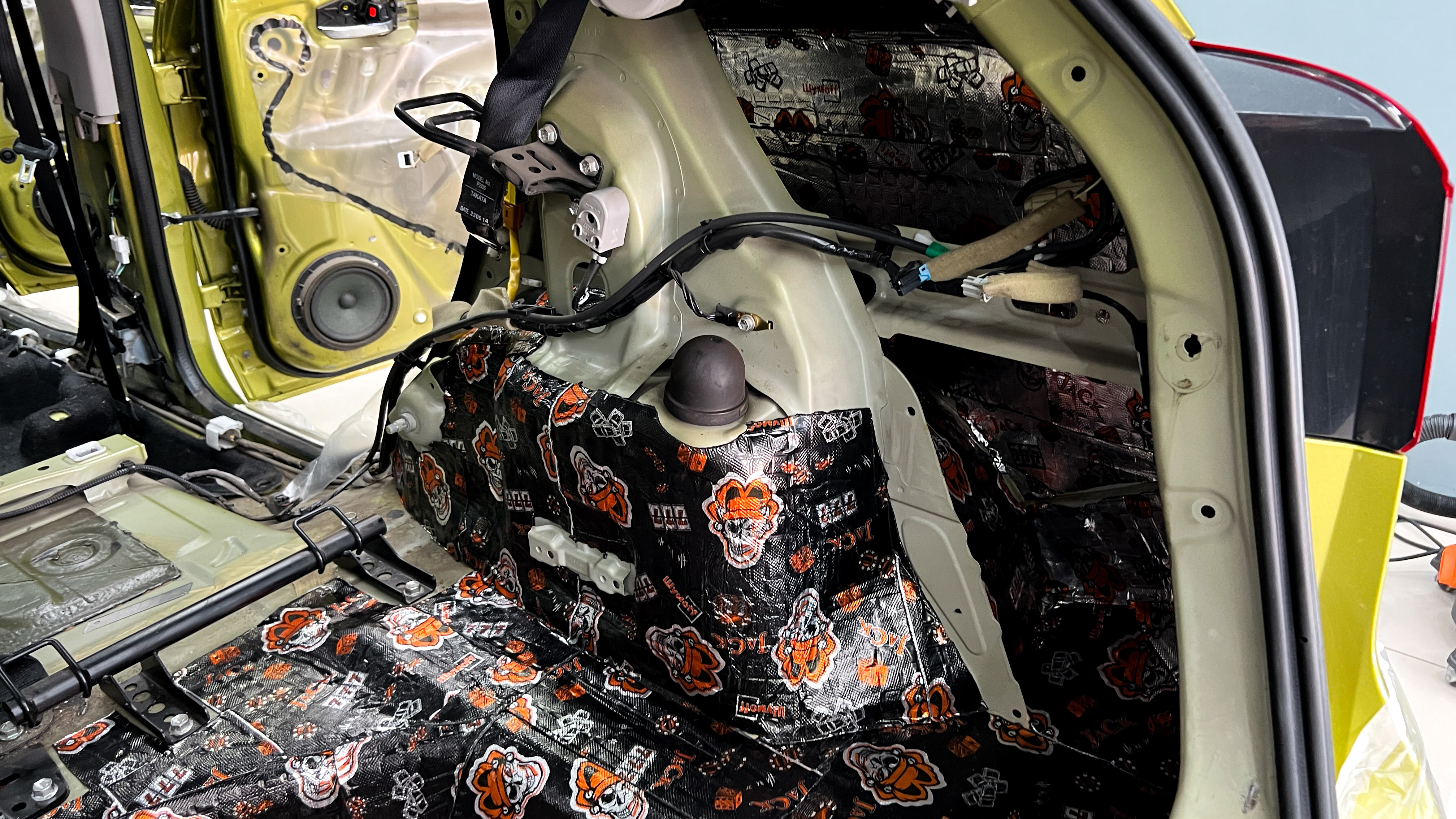 Пол от моторной перегородки и до заднего сиденья оклеивается толстой виброизоляцией Шумофф Super Jack. Под заднее сиденье клеится виброизоляция Шумофф Black Jack.