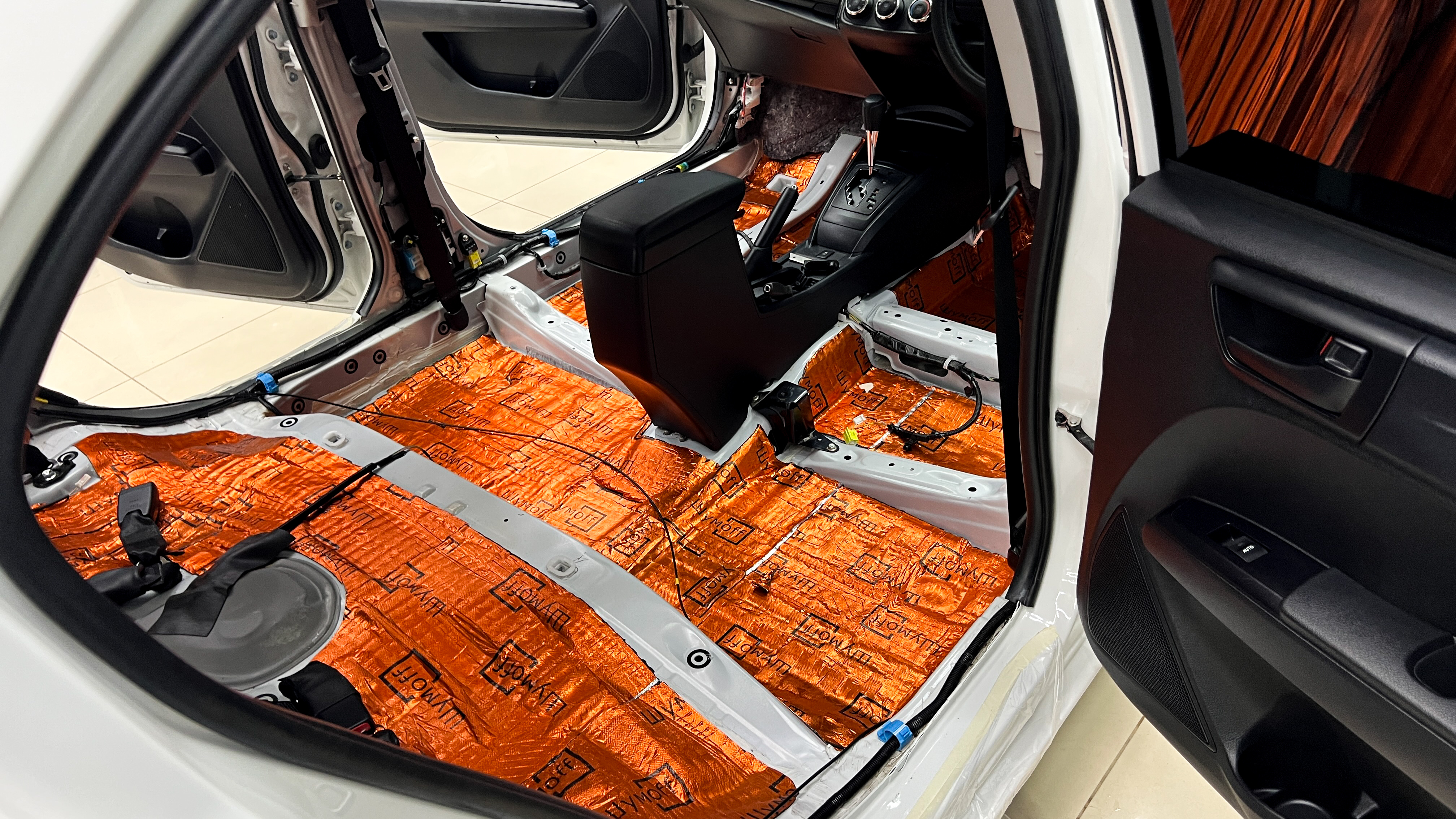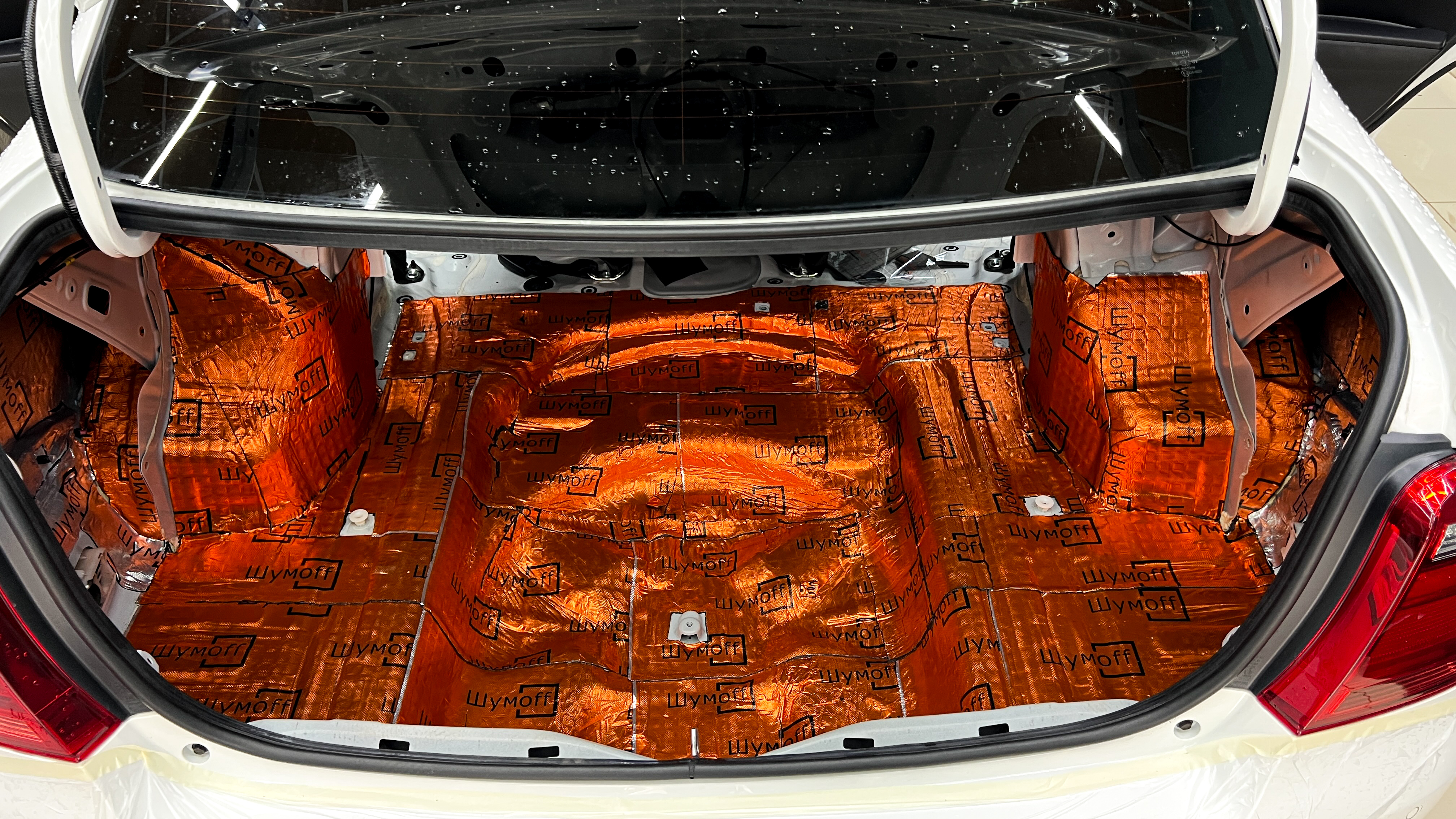 Дно багажника и крылья оклеивается шумопоглотителем Шумофф Комфорт 6, арки оклеиваются шумопоглотителем Шумофф Flex А15.