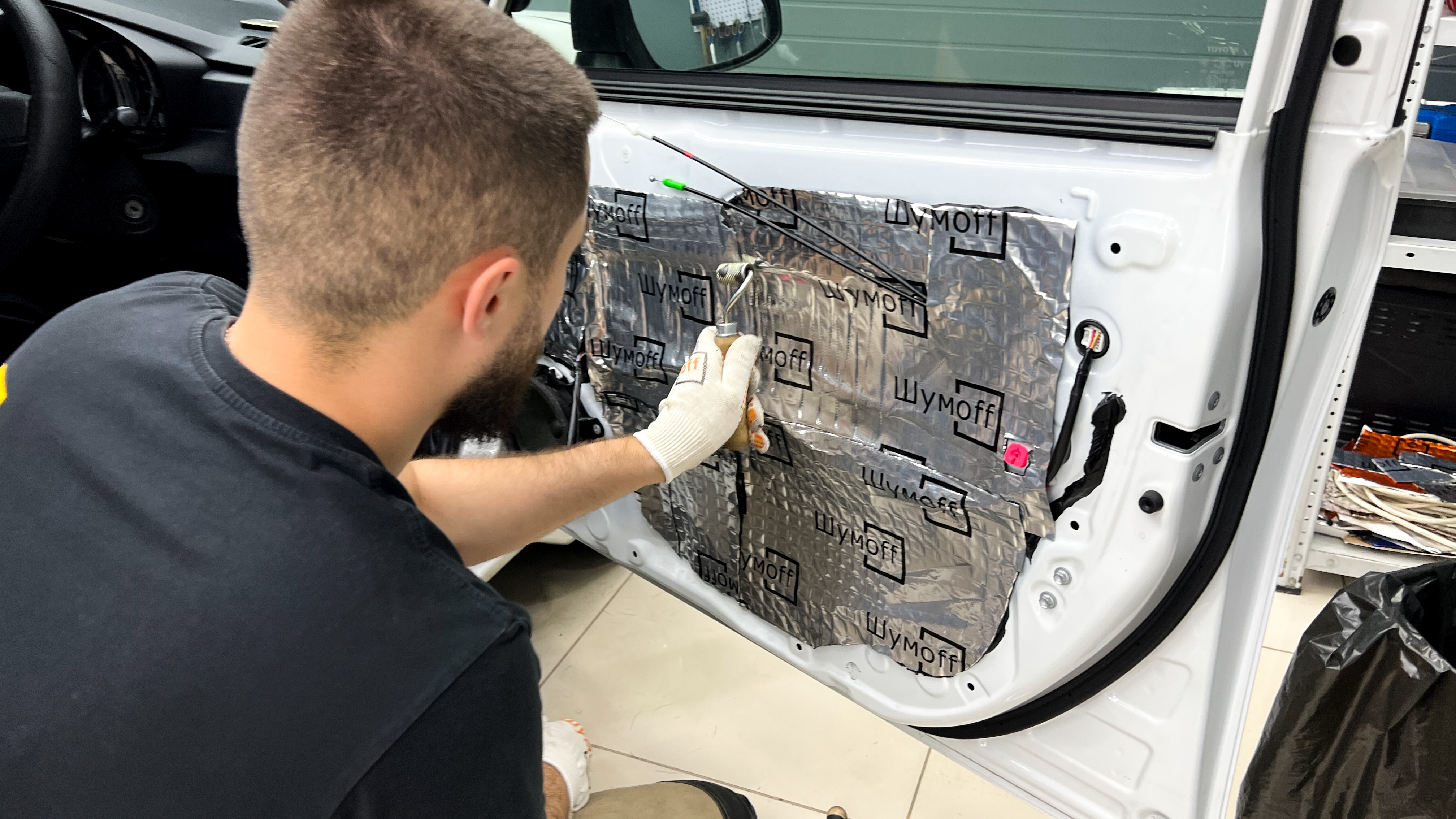 Поверх виброизоляции клеится мощный шумопоглотитель Шумофф Комфорт 6.