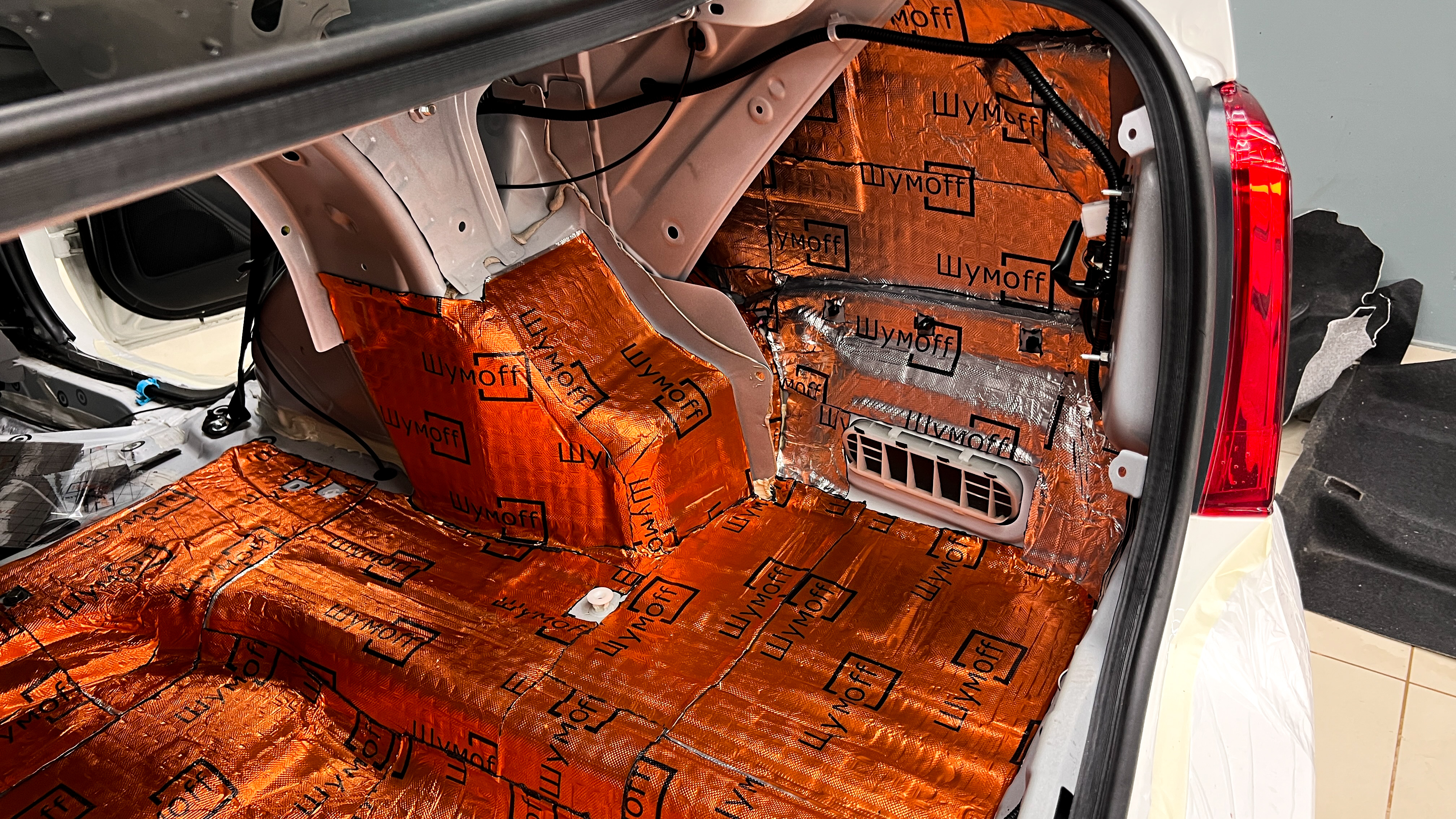 Дно багажника и крылья оклеиваются шумо и теплоизолятором Шумофф П4 4. Арки оклеиваются шумопоглотителем Flex A15.