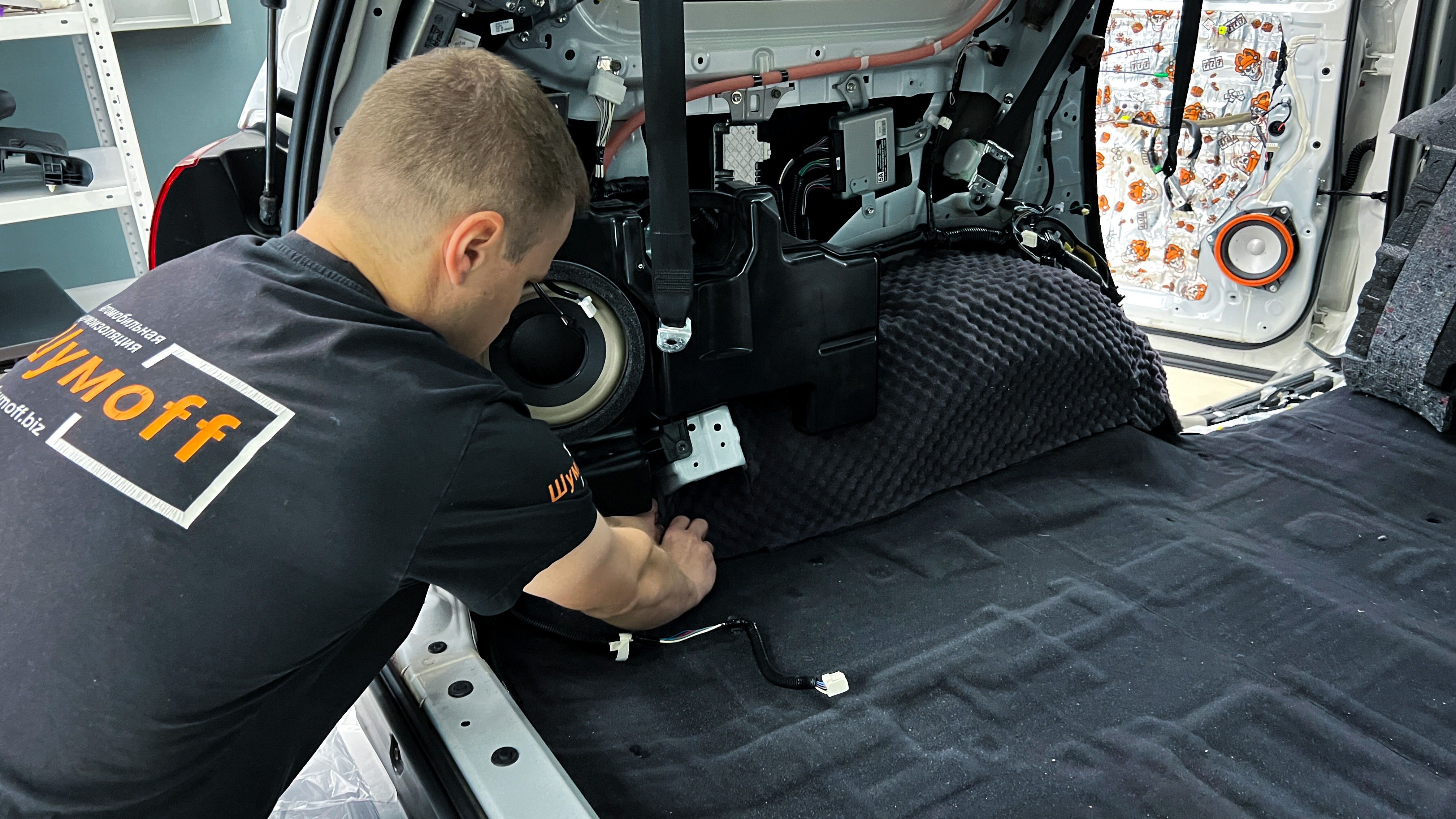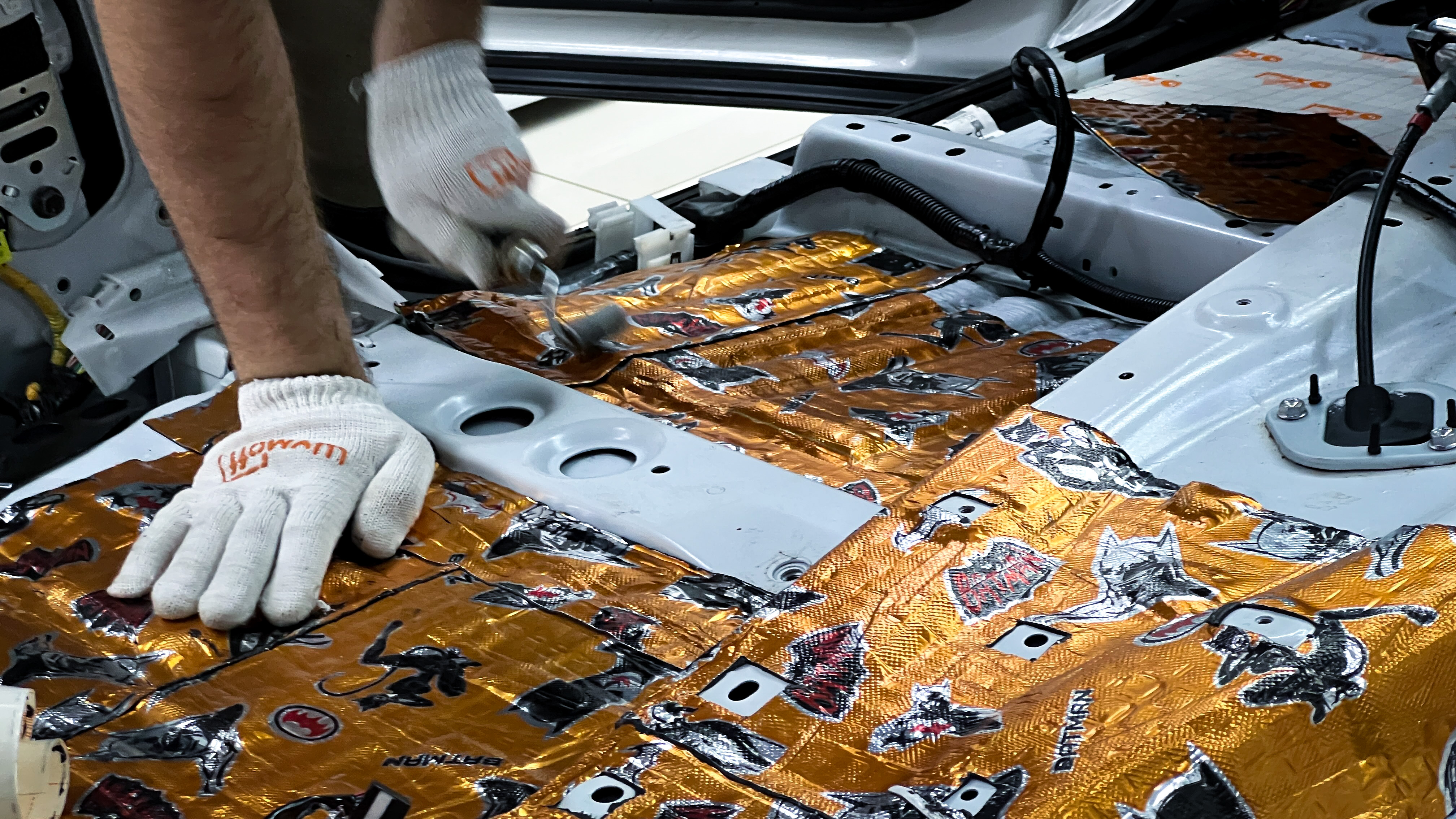 Дно багажника и крылья оклеиваются шумо и теплоизолятором Шумофф П4 4. Арки оклеиваются шумопоглотителем Flex A15.