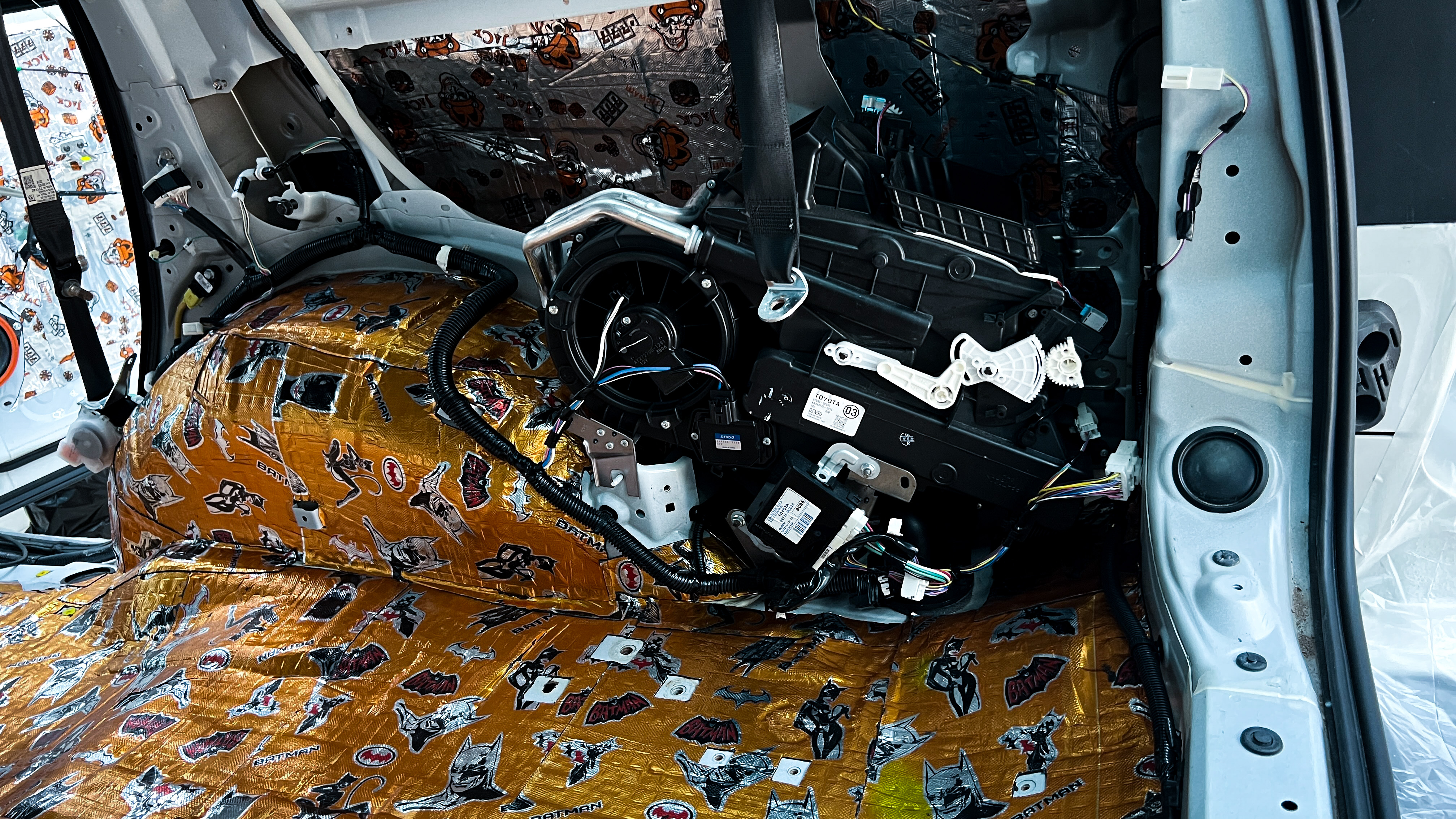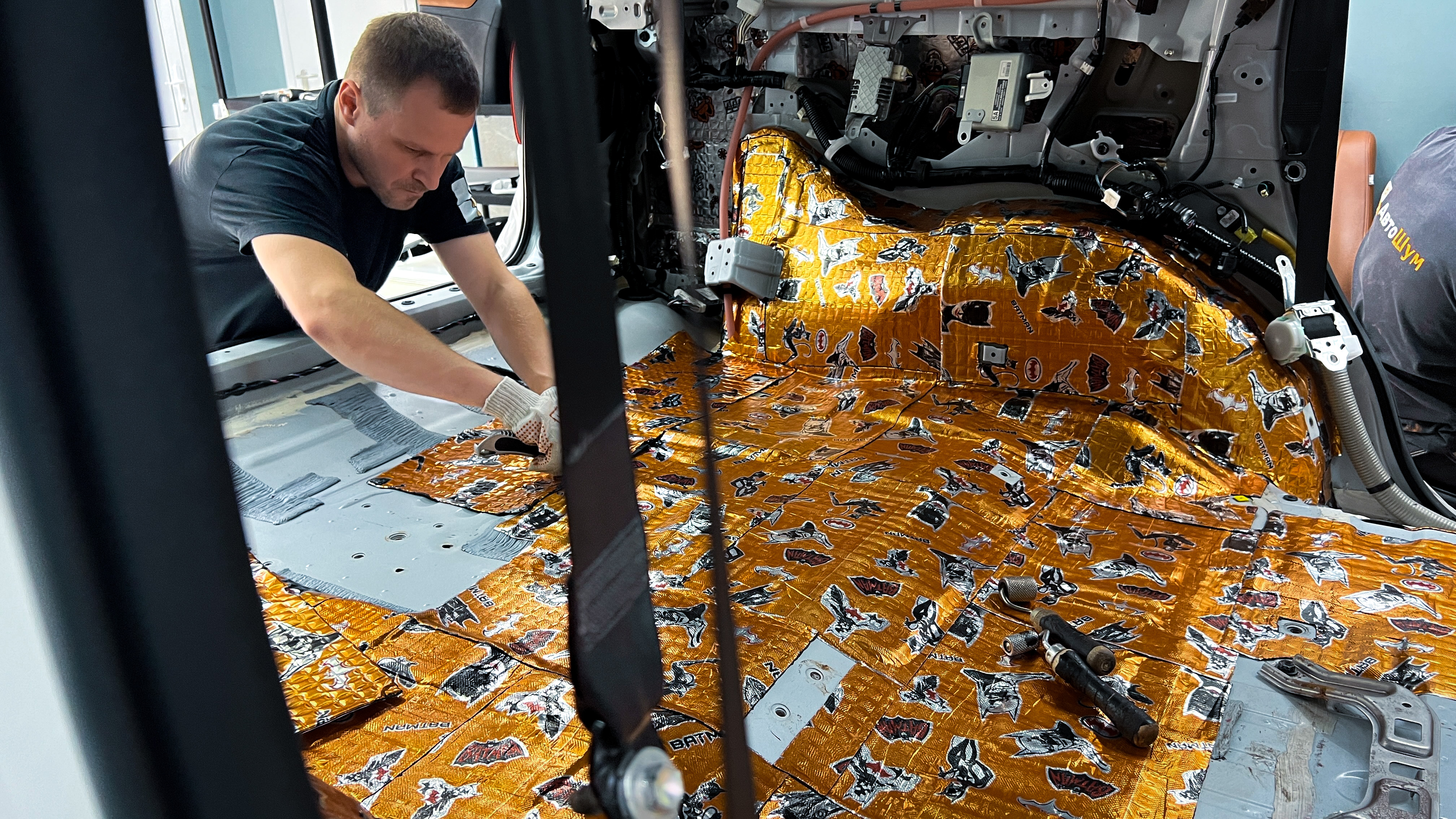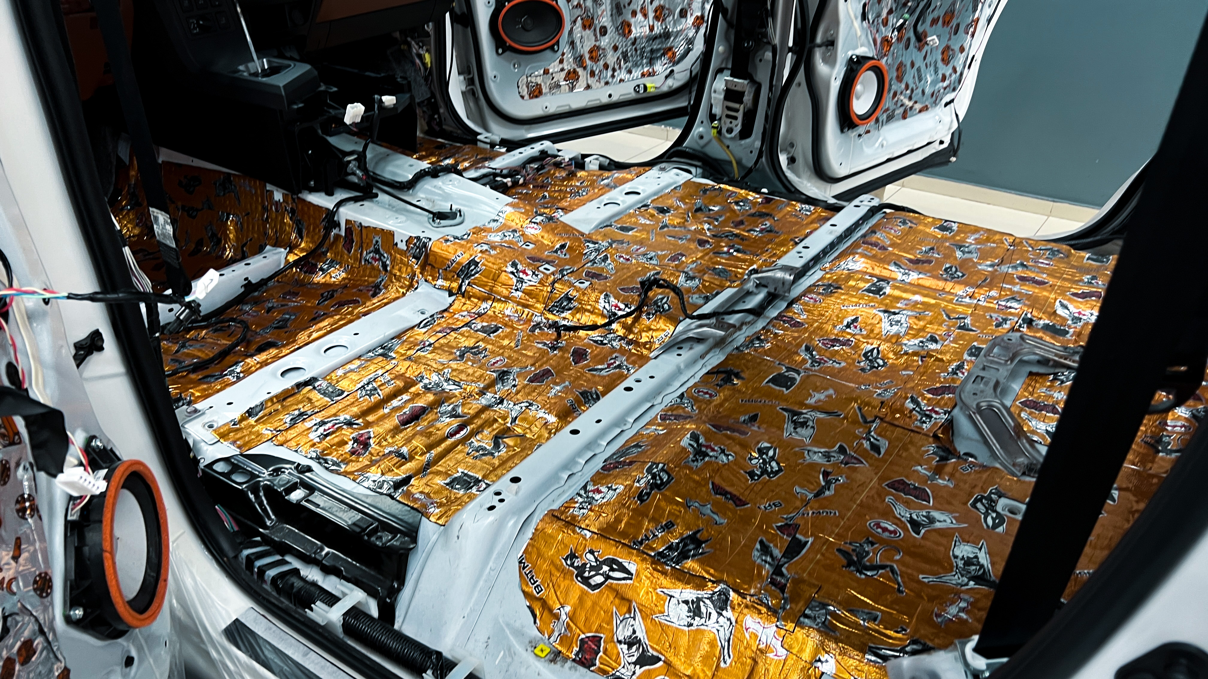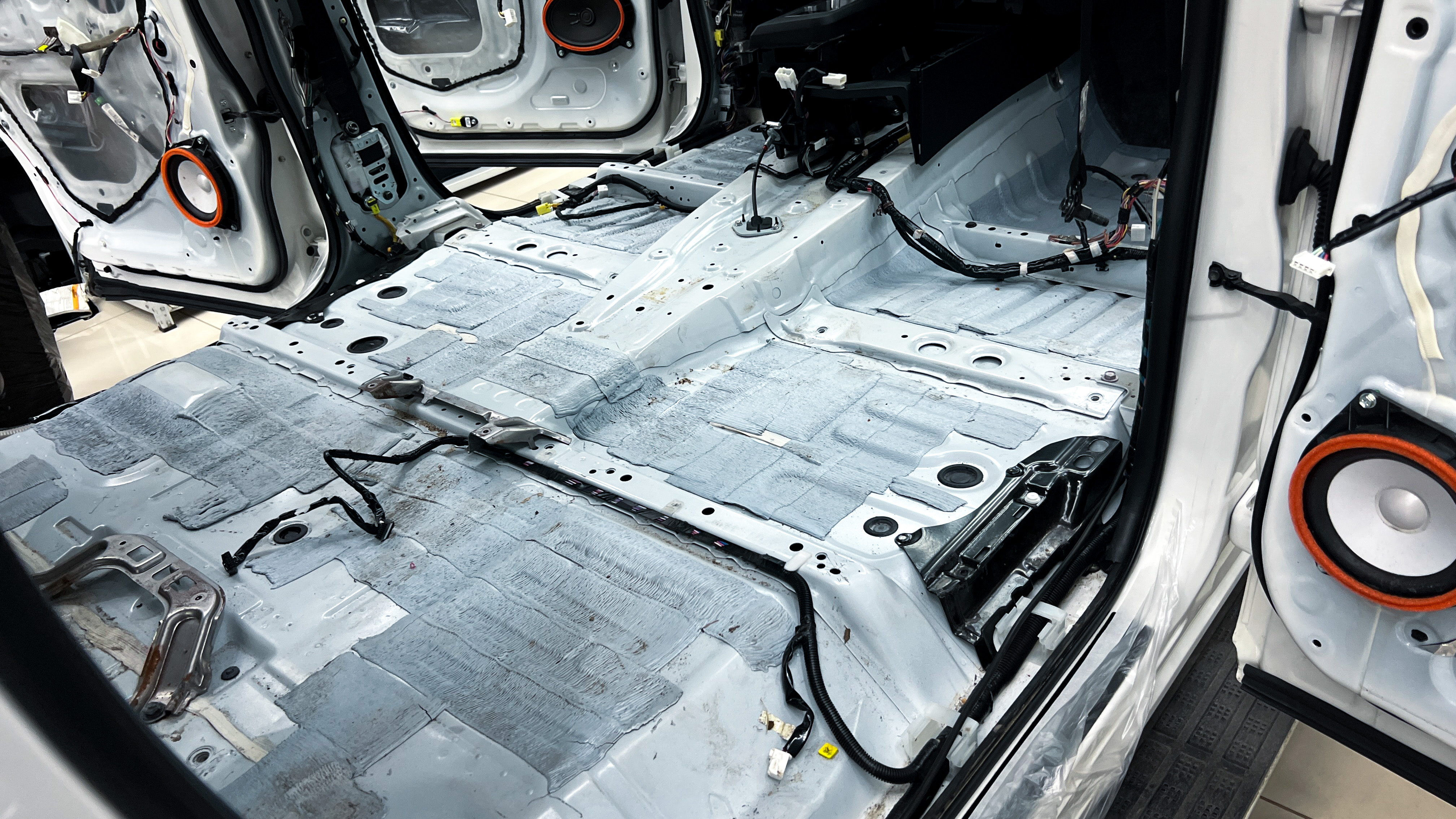 От моторной перегородки и до заднего сиденья вмести с ним клеится мощный многослойный шумо и звукоизолятор Шумофф Prizma 6.