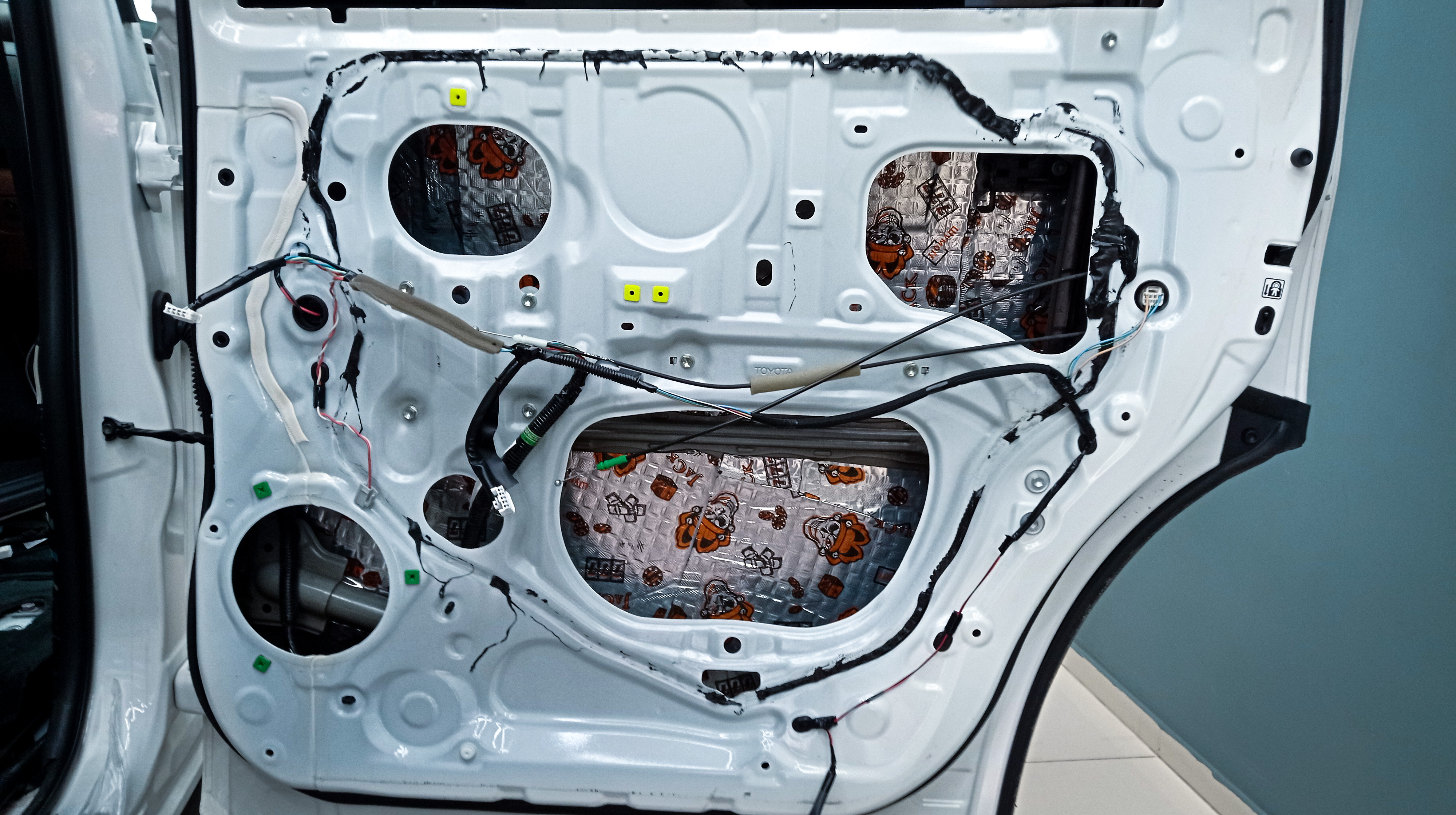 Для второго слоя на технологические отверстия используем так же Шумофф Jack. Этот слой помимо еще одного барьера для внешнего шума позволит раскрыть потенциал акустической системы, установленной в дверях.