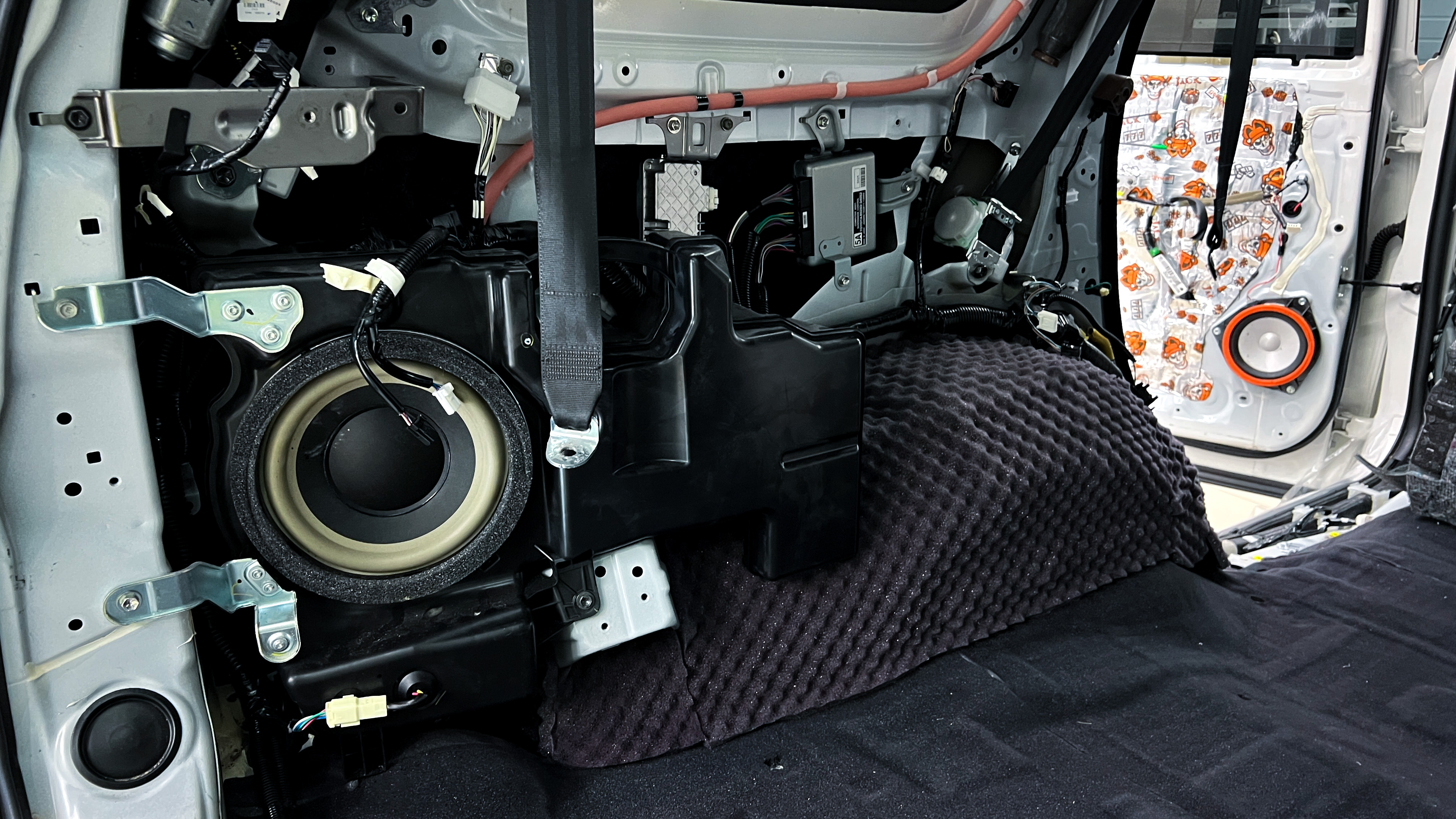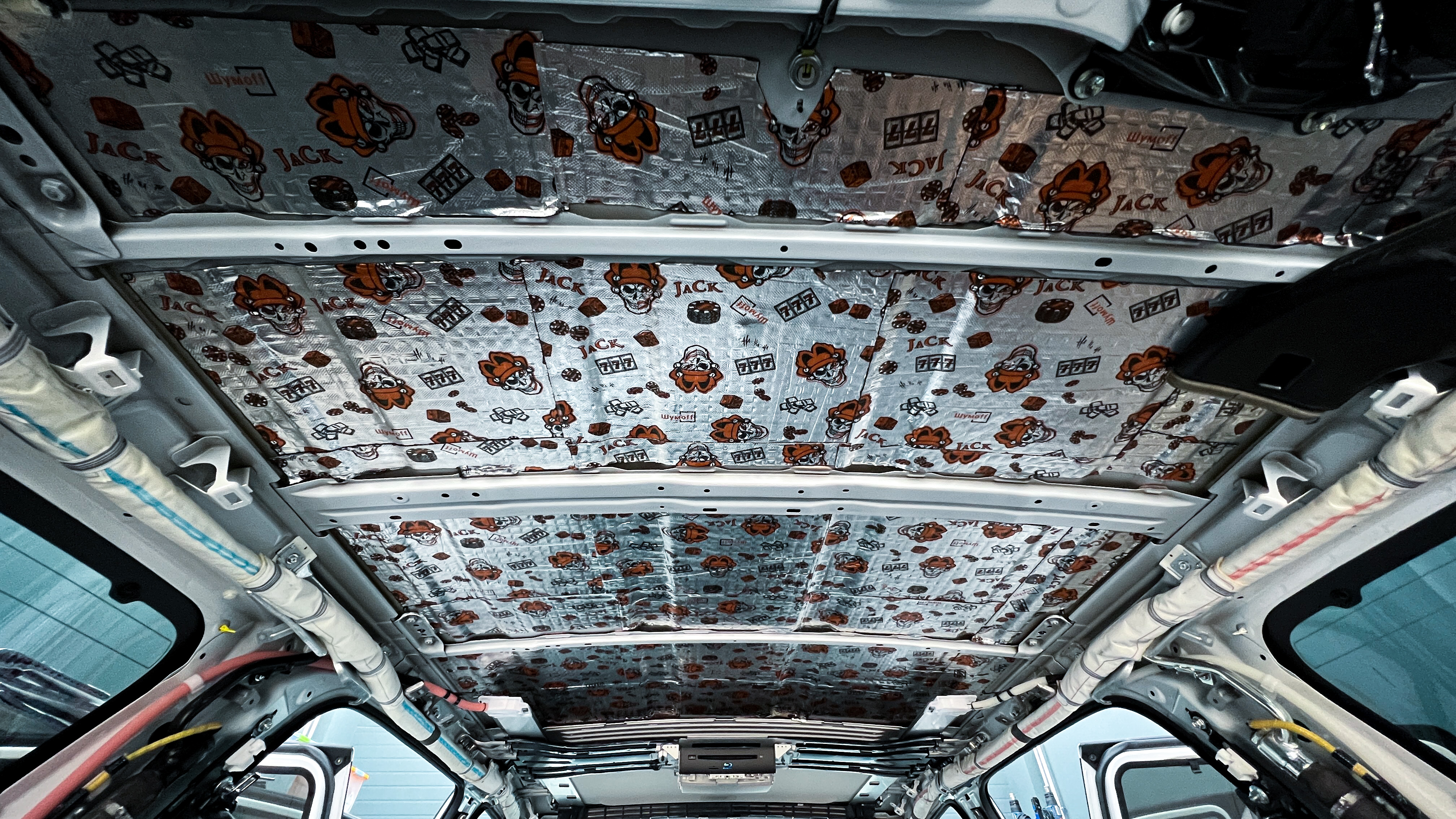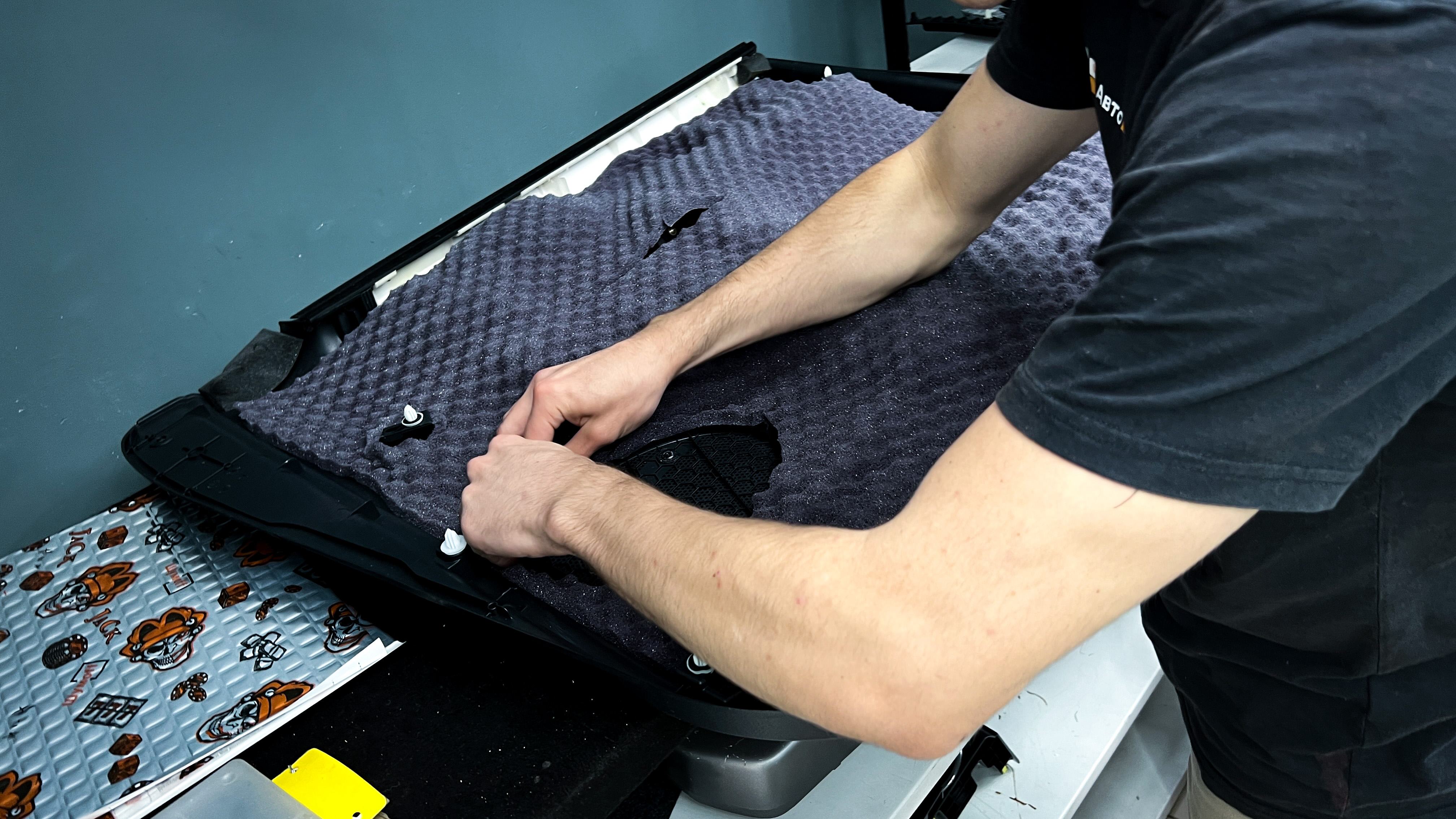 Переходим к оклейке самого корпуса панели, первым слоем частично наносим виброизоляцию Шумофф Joker, создавая тем самым идеальный баланс. Такая частичная оклейка позволит нам чрезмерно не утяжелять панель и придать ей необходимую сбитость