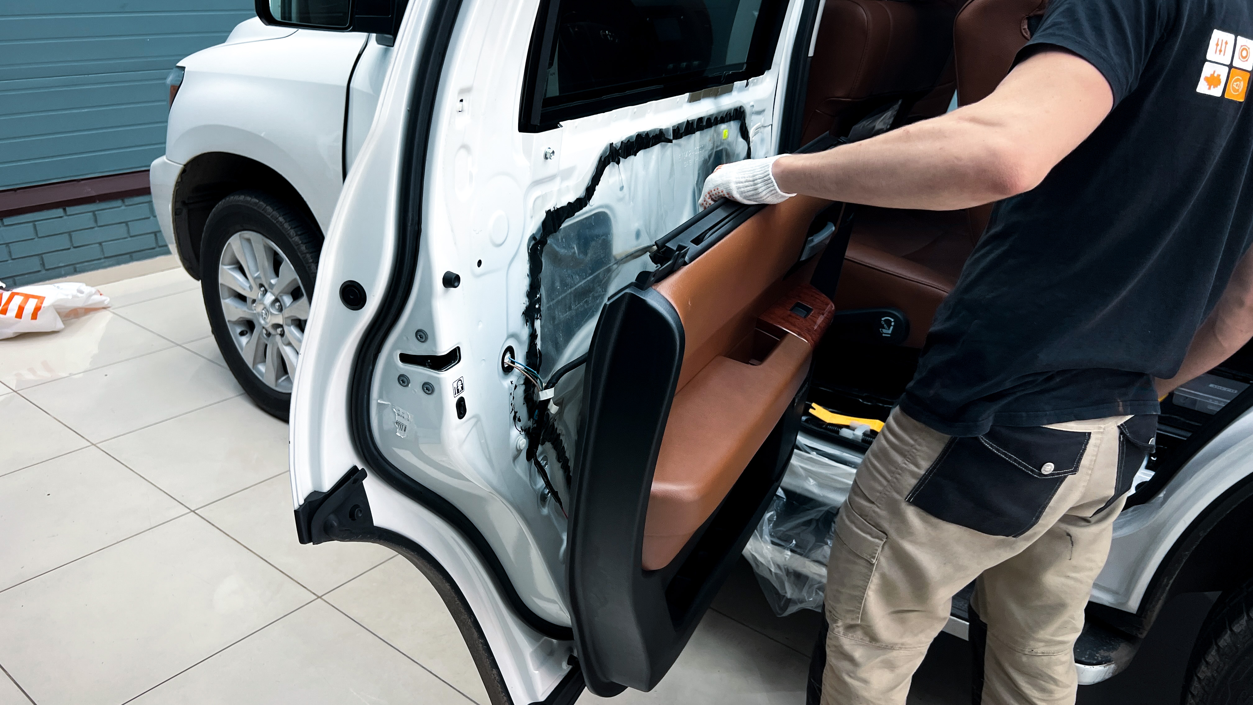 Обшивку пятой двери оклеиваем Flex А15, для устранения ненужных скрипов и бряков.