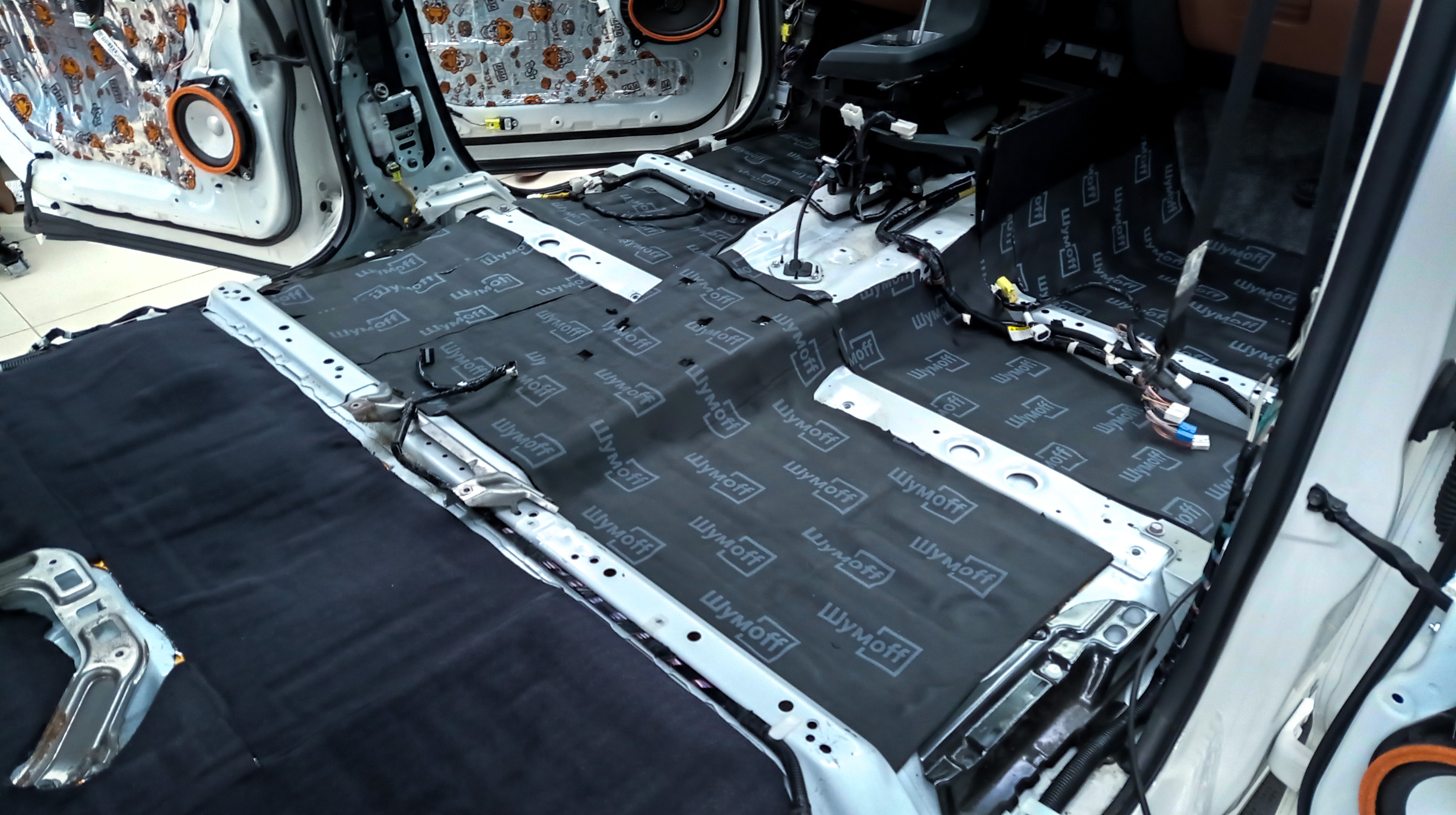 Пол от моторной перегородки и до заднего сиденья оклеивается толстой виброизоляцией Шумофф Super Jack. Под заднее сиденье клеится виброизоляция Шумофф Black Jack.